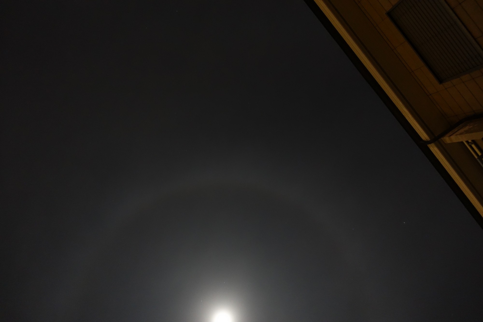 Schöne Mondhalo heute 09.02.25 um 23:00 in Zürich. Höhe Mond war 68°, eine einbeschriebene Halo also. In Theorie könnten sich hier bei der Höhe chice ganz abgesetzte Nebenmonde sowie ein Horizontalkreis ausbilden, von dem allerdings nix zu sehen war, auch nicht in völliger Überbelichtung.