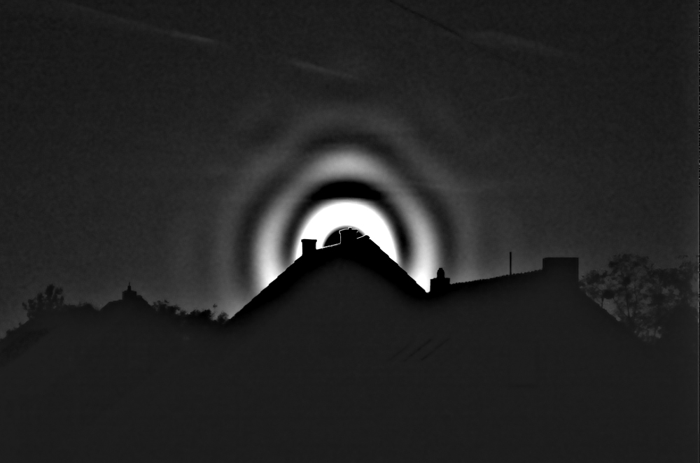 einen Tag später und einen Tag vor Vollmond ging der Mond hier mit einem Hof auf. Da dieser sich jedoch etwas länglich darstellte und weder Wolken, noch Hochnebel ersichtlich waren, holte ich die Kamera, und siehe da, es lag wie wohl gestern schon bei Benjamin eine typisch verknotete Kiefernpollenkorona vor, die zumindest in der nicht zu späten Dämmerung auch visuell auffälig war.