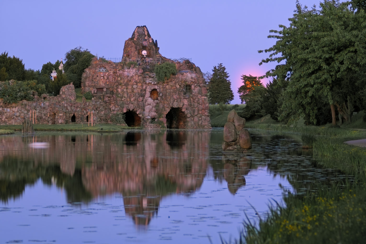Mondaufgang an der künstlichen Felseninsel genannt Der Stein, mit Weidetieren: