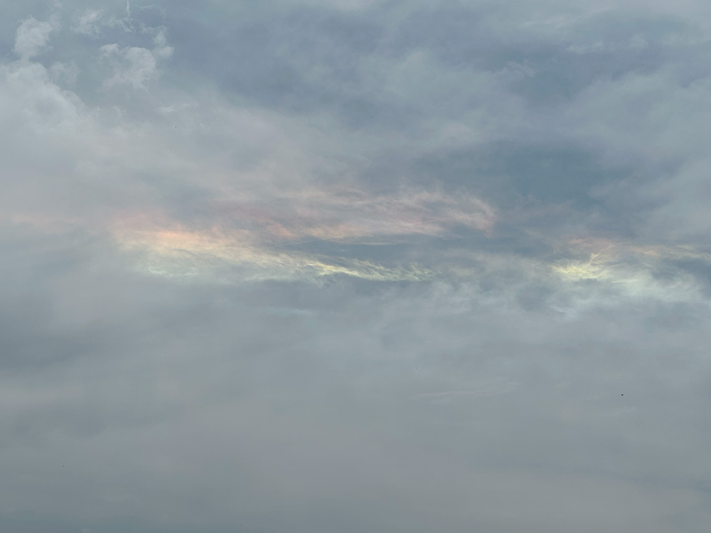 Er beschreibt die Farben als sehr intensiv, auch in den Minuten vor der Aufnahme waren die Farben noch intensiver. Ist das einfach ein Fragment eines hellen 22°-Rings? Oder doch ein ZHB? Oder bin ich komplett auf dem Holzweg? Die Sonne ist knapp oberhalb des Bildes und die Position kann angedeutet erkannt werden.