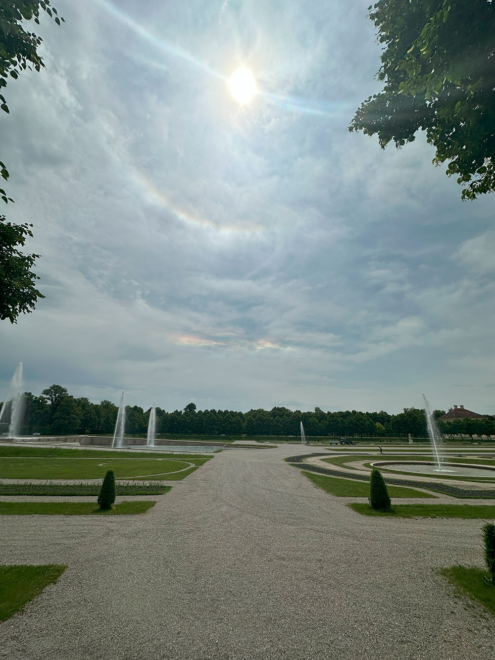 Am 4.6. konnte ich meinen ersten ZHB in diesem Jahr beobachten. Während der Besichtigung des Schlosses Schleißheim bei München und trotz tiefhängender Regenwolken waren durch Lücken die Cirren weiter oben und dadurch auch ein schöner ZHB und 22H zu sehen. Das Phänomen war auch ohne Sonnenbrille auffällig. Uhrzeit 13h06 bis 14h00 MESZ (Sonnenhöhe 64.2° --> 62.7°).