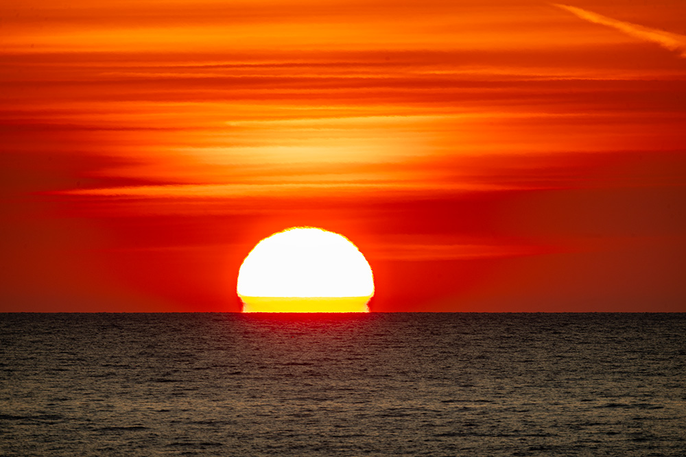 "Verformte" Sonne zum Sonnenaufgang gestern Morgen (14.06.) an der Ostsee bei Timmendorfer Strand: