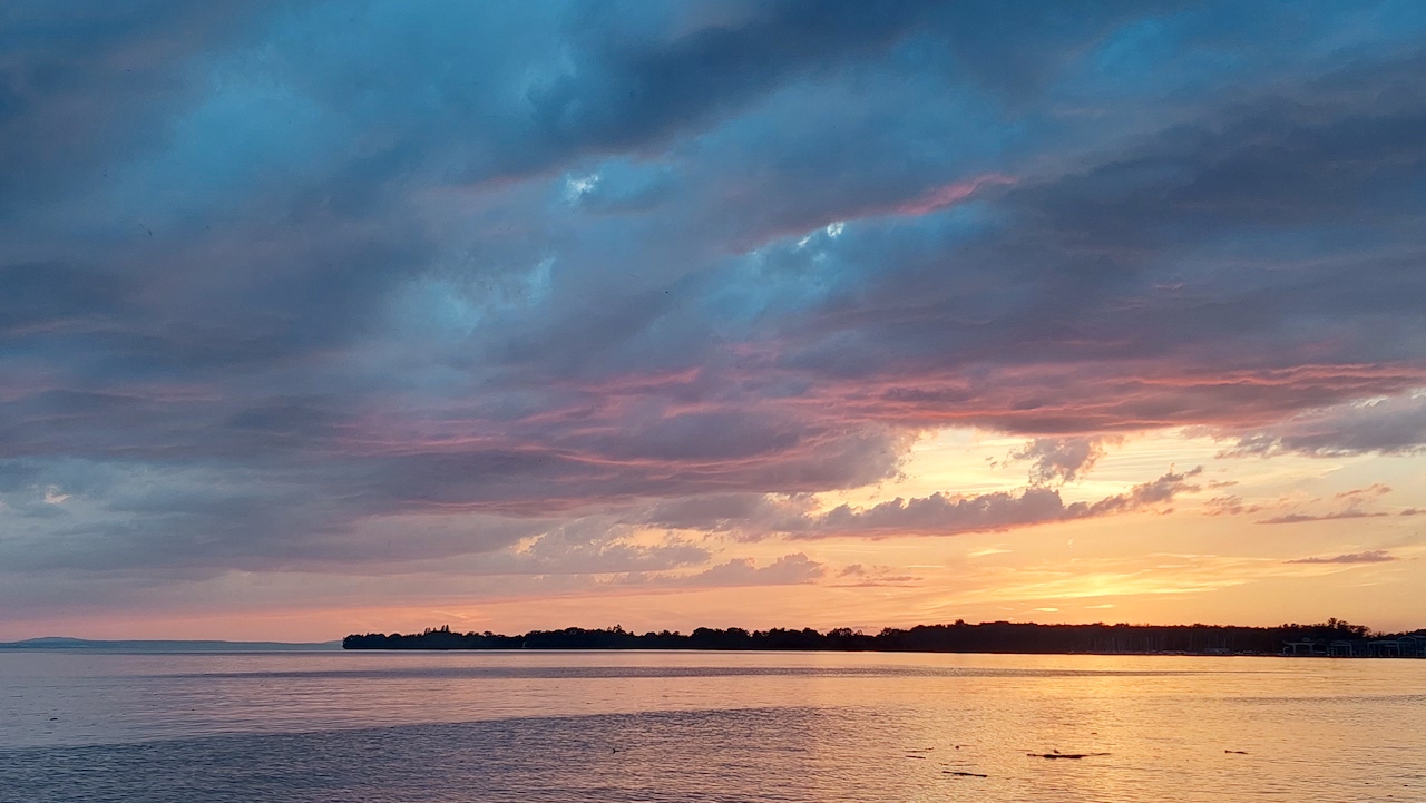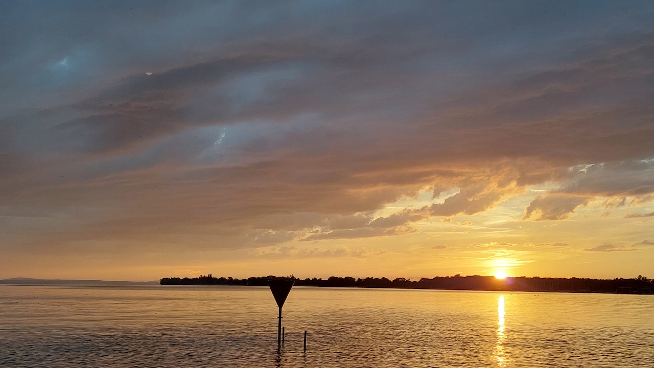 Ich schließe mich hier mal an, da die Frage eine Beobachtung vom vergangenen Sommer bei mir aufgefrischt hat: Bei einem Bodenseeaufenthalt während der Pfingsferien habe ich am 7. Juni (in Nonnenhorn) folgende Beobachtung gegen (und nach) Sonnenuntergang (um 21:08 MESZ verschwand die Sonne hinter den Horizontbäumen, Sonnenuntergang dürfte gegen 21:09 MESZ erfolgt sein) gemacht: