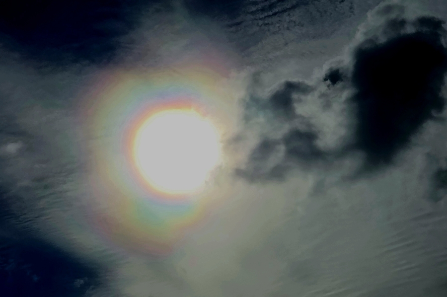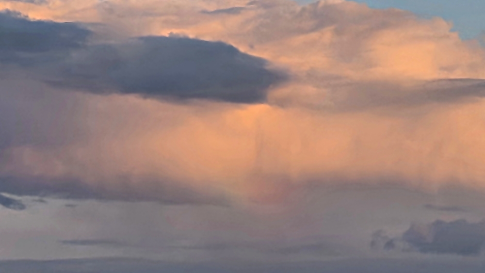 Am unteren Rand des Wolkenbands sieht man das kleine Fragment eines Regenbogens.