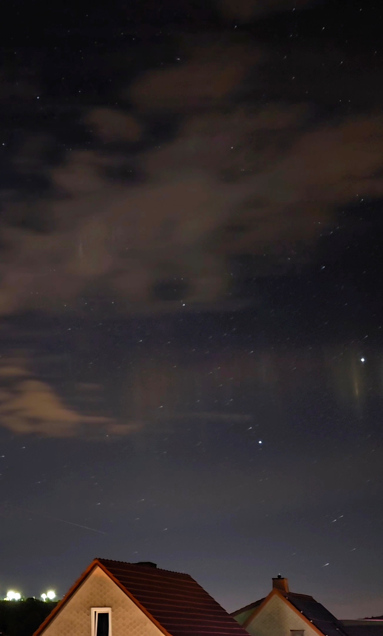 Ich habe gestern am 14.09.25 um ca. 23.00 Uhr ein paar Lichtstrahlen aufgenommen. Ich bin mir nicht sicher, ob das Lichtsäulen oder Polarlichter sind. Aufgenommen habe ich mit dem Samsung S24 ultra im Hyperlapsmodus. Das angehängte Foto ist ein extrahiertes Foto daraus. Das Video zeigt das noch viel besser, vor allem die Bewegung, wie bei Polarlicht. Leider kann ich das Video hier nicht hochladen. Das Foto spiegelt das nicht so toll wieder.
