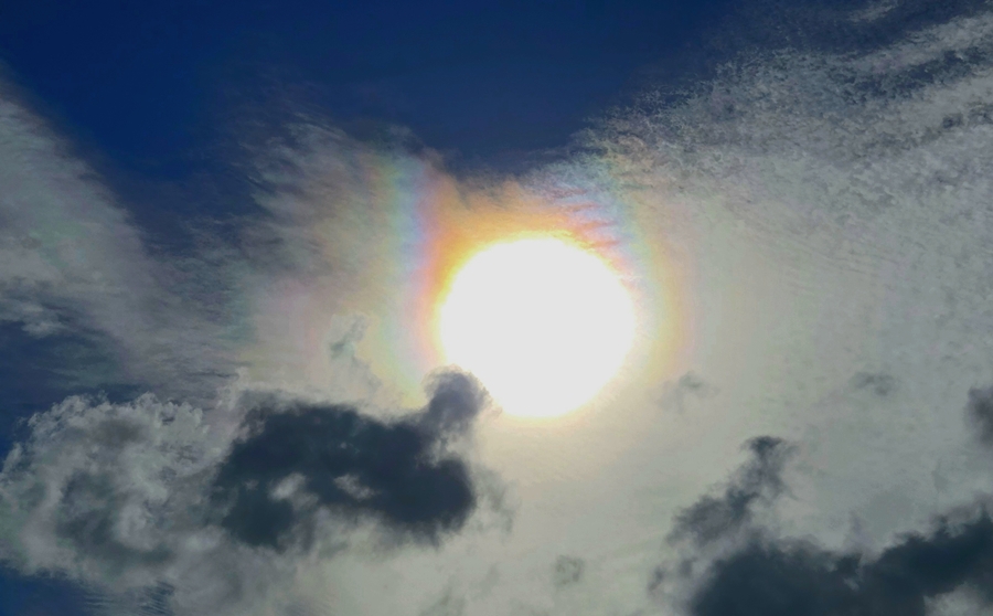 Am unteren Rand des Wolkenbands sieht man das kleine Fragment eines Regenbogens.