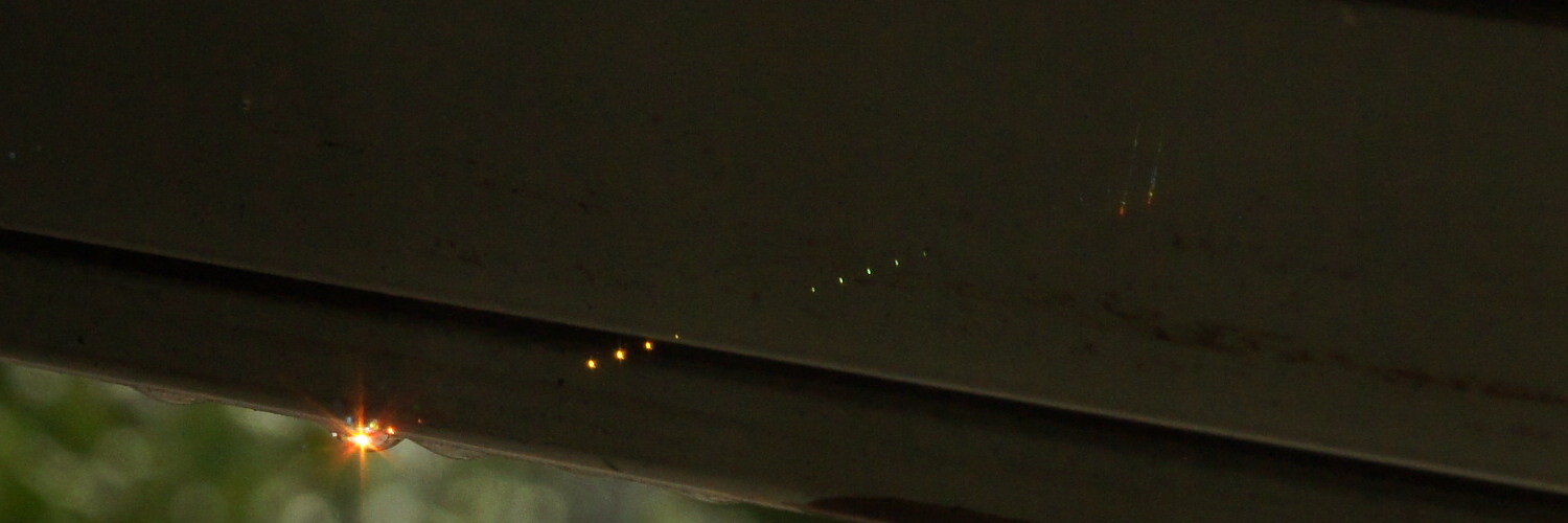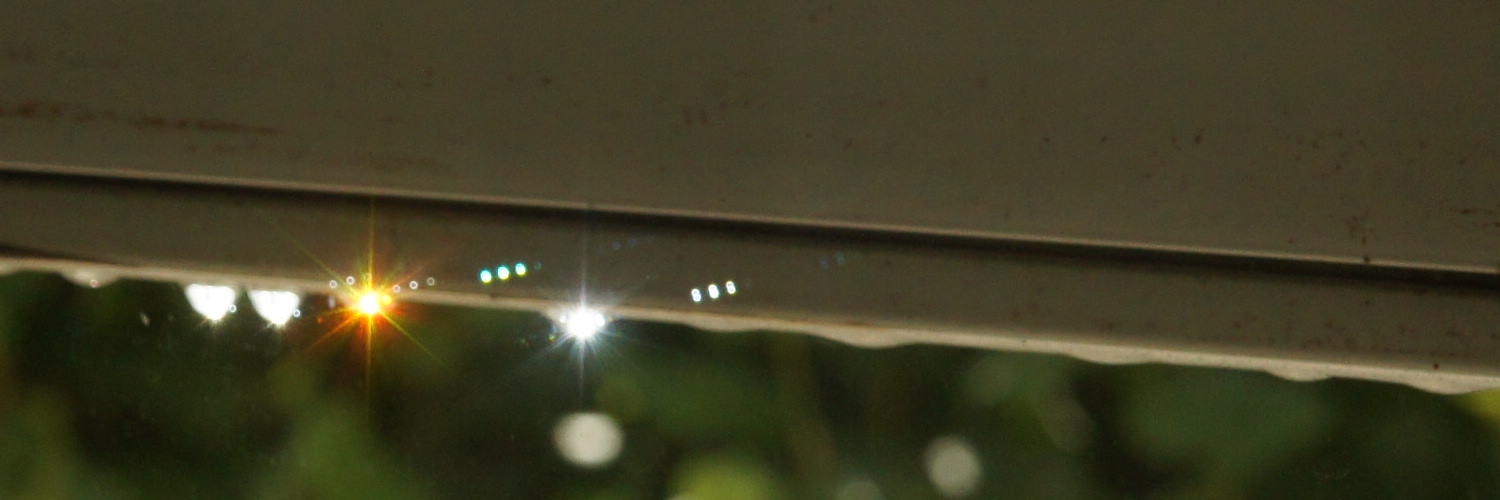 Sonntag Morgen habe ich gelegentlich die Möglichkeit, etwas länger zu schlafen. Heute war so ein Sonntag. In der Nacht hatte es kräftig geregnet, aber morgens weckten mich die Sonnenstrahlen. An dem Rolladen hatten sich einige Regentropfen gebildet, die nicht mehr abgetropft sind – und das Sonnenlicht wie ein Prisma in allen Regenbogenfarben streuten. Das ist wahrlich nichts besonderes, da schon wiederholt beobachtet. Die Faszination aber bleibt, und so holte ich meine Kamera, um die Farben einzufangen. Das enttäuschende dabei: es ist meistens nur eine Farbe an einem Tropfen einzufangen, da jeder Tropfen das Licht in eine etwas andere Richtung streut.