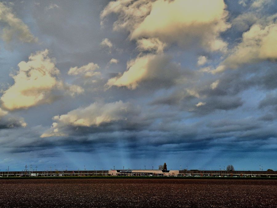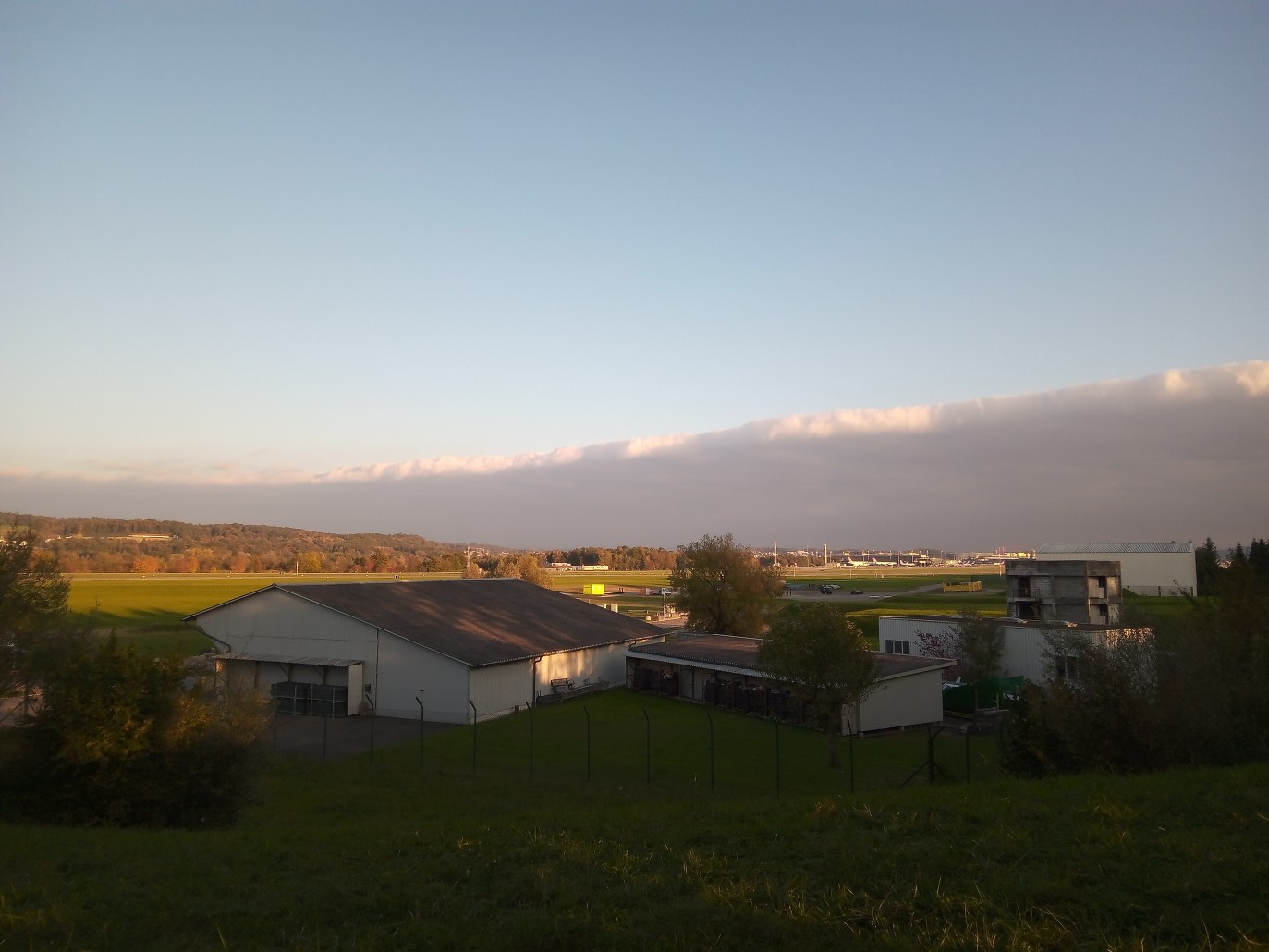 Sich zurückziehende bzw. verbleibende Hochnebelbank. Am Flughafen Zürich. Sehr eindrücklich, erst 1 Std. vor Sonnenuntergang, der Rest hat sich wohl aufgelöst, im Süden gegen die Alpen zu blieb es aber. Praktisch auf 180° Breite, war gar nicht einzufangen mit der Kamera. Gem. Swissmeteo Höhe ca. 1500m.
