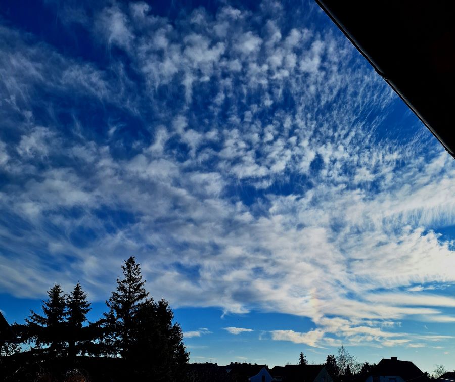 am frühen Vormittag zeigte sich über dem Wiener Becken nebst irisierenden Wolken ein Hauch von Halo und eine sehr schwache rechte Nebensonne, heute Nacht soll Österreich von einer Kaltfront aus West überquert werden. Wir hatten einen angenehm milden Tag mit einem Maximum von 16.7 Grad an meiner Station.