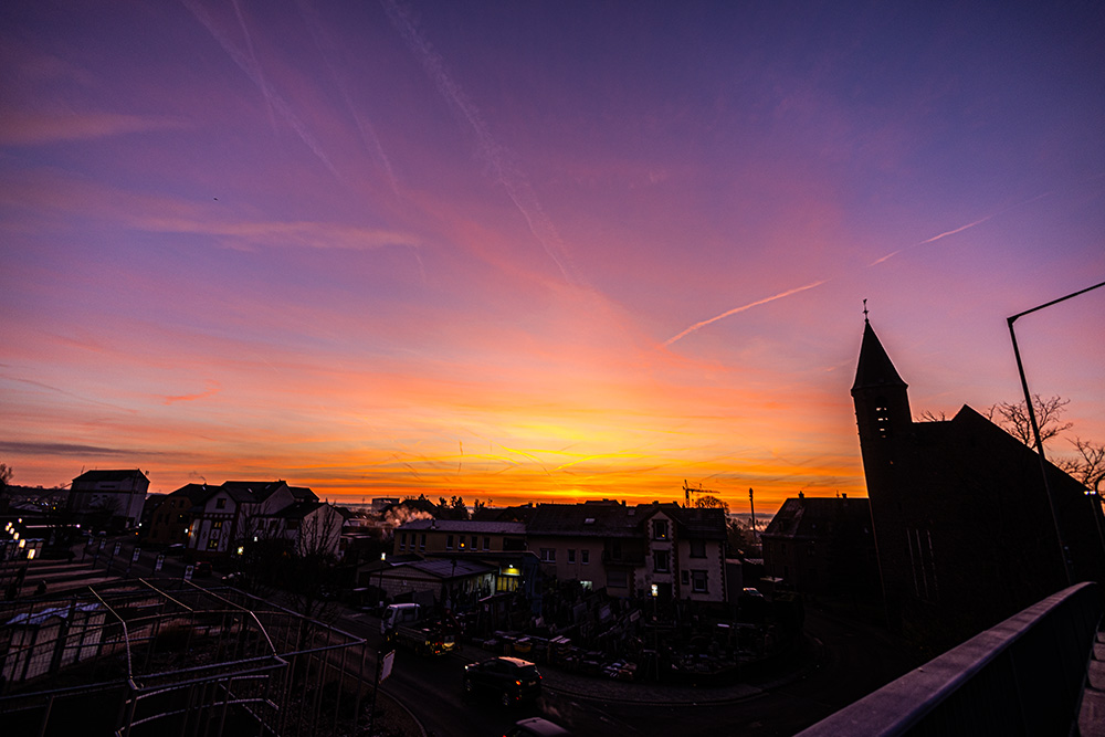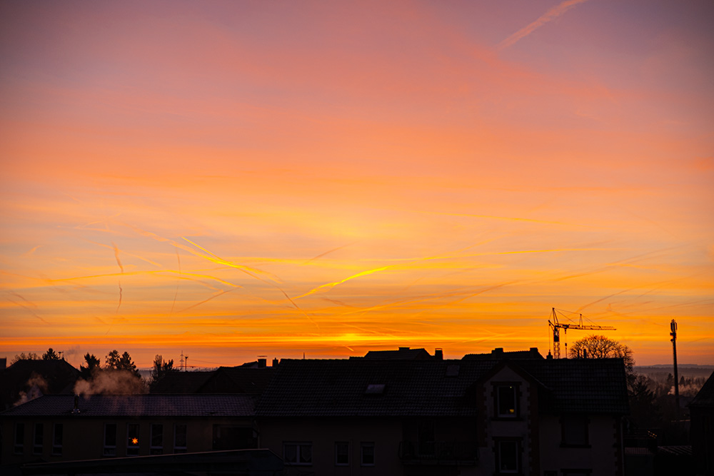 Heute gab es über dem Ruhrgebiet ein tolles Morgenrot. Schon um 8 Uhr, eine halbe Stunde vor Sonnenaufgang, war zu erkennen, dass da was kommt: