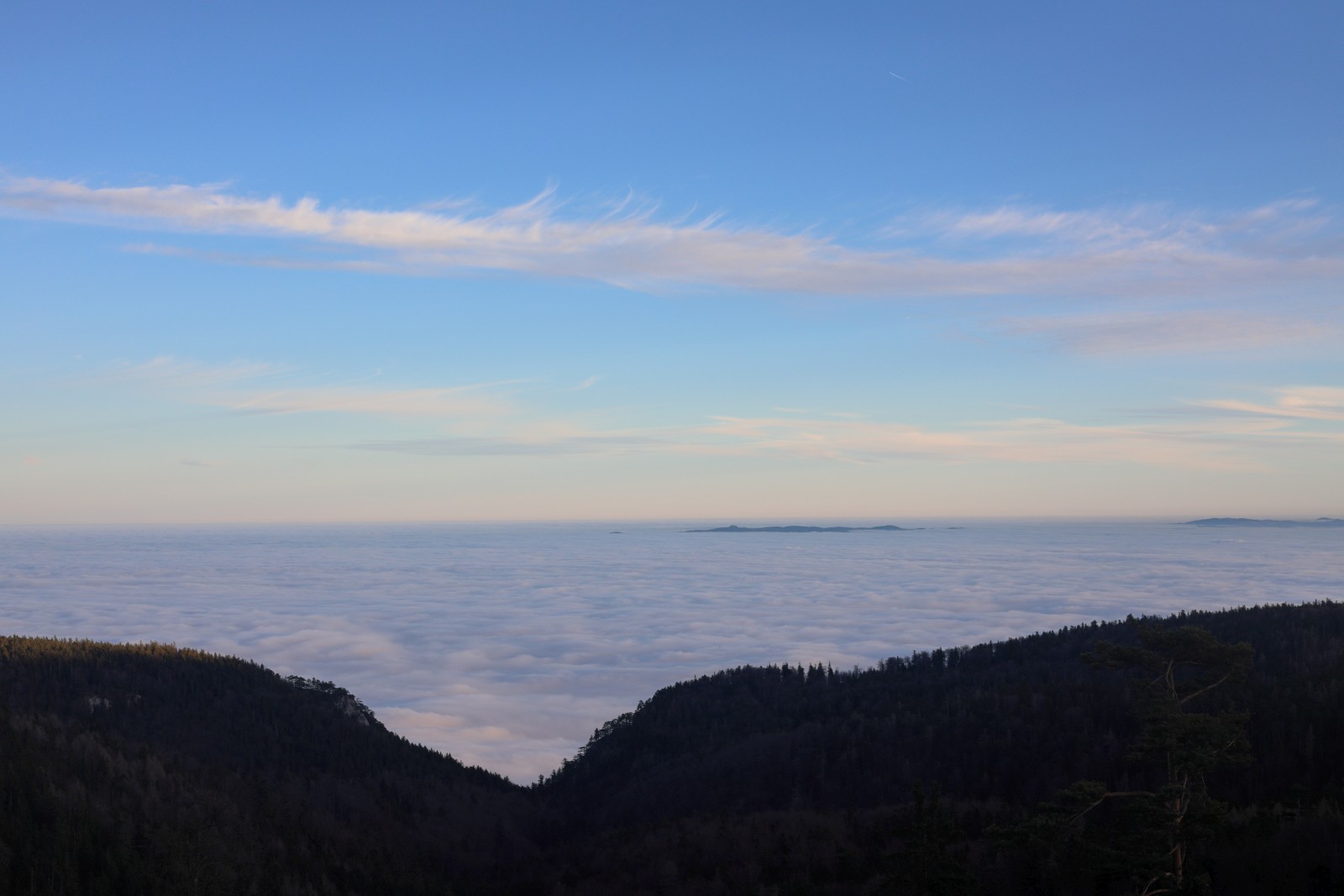 Die Auffahrt vom Wiener Becken auf die Hohe Wand hätte dich mit Sicherheit hoch begeistert. Diese deprimierende, unbeirrbar herumhängende Wolkenschicht zeigt sich im Flachland als Stratus nebulosus, opakus, praecipitatio, es kommen immerhin 0,5mm feinster Nieselregen binnen 24h runter, bzw. ist man davon von allen Seiten umtrieft. Diese Wolkenart ist so zäh und beständig. Doch mit jedem gewonnenen Höhenmeter zeigt sie andere ihr zugeschriebene Eigenschaften wie das freundliche translucidus, und mehr und mehr dringt die diffuse Position der Sonne durch, es folgt fractus bis endlich der blaue Himmel durchbricht und dieses bedrückendste Gewölk aller Wolken kein Thema mehr ist. Von oben betrachtet ist diese unsympathische Masse dann aber ein romantisches Nebelmeer, das zwei völlig andersartige Welten trennt. Für Nebelliebhaber und Fotografen bietet die Grenzschicht sehenswerte Motive. Die Lichtverhältnisse sind unbeschreiblich zauberhaft. Gen Abend spiegelt sich das Rot des Sonnenunterganges auf der Oberfläche, in die ich dann wieder eintauchen musste, um nach Hause "unter Wasser" zu fahren.