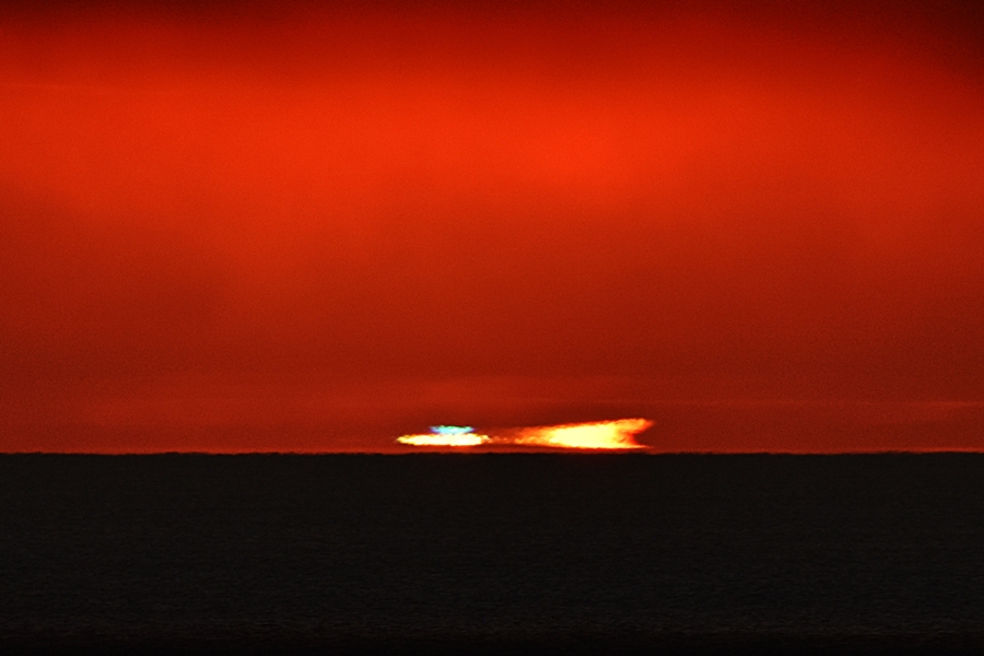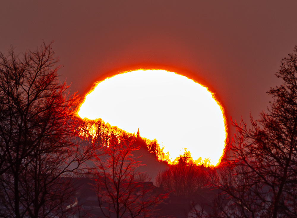 Am gestrigen 25.12. konnte ich zum Sonnenuntergang einen teils zerrissenen, bzw. verformten Rand der Sonne beobachten: