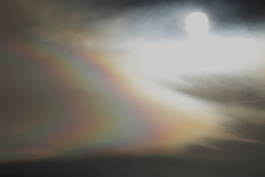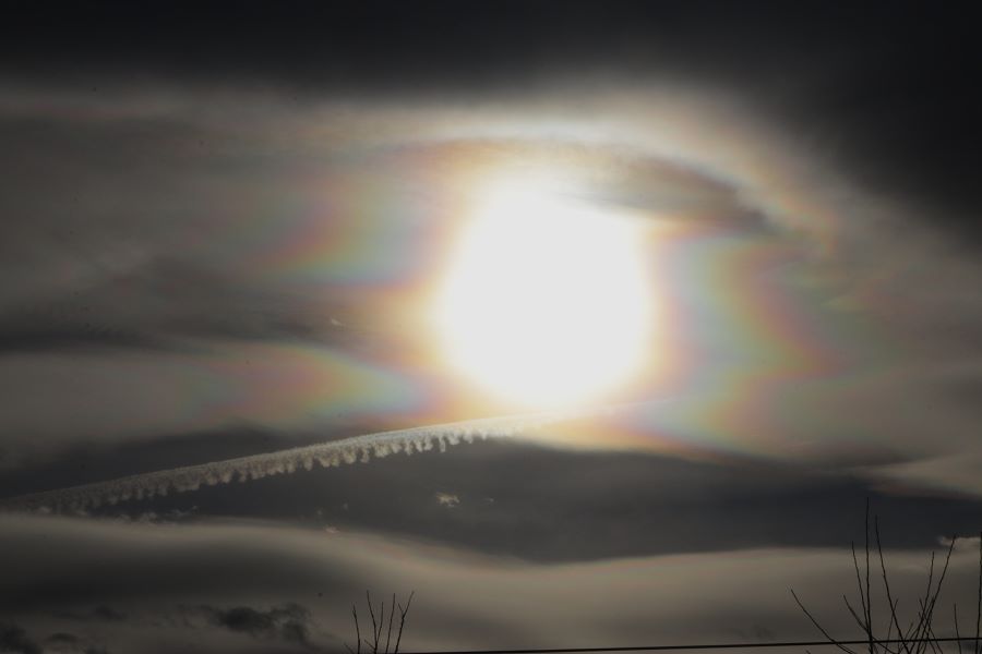 Heute Vormittag als auch Nachmittag zeigten sich über dem Wiener Becken in einem heftigen Föhnwind um die 60Km/h aus WNW stark irisierende Ac len und Kondensstreifen, die sich bläulich in Sonnennähe färbten. 6 Grad C, 61% RF. Kondensstreifen lösten sich schnell wieder auf.
