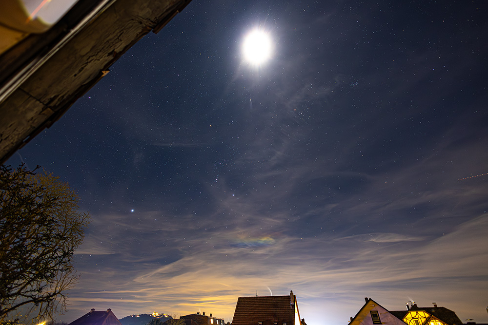 heute (25.02.2026) gab es in Kirchhain nach längerer Zeit mal wieder interessante Haloaktivität. Am Abend hatte ich ein paar Bilder von Nebensonnen in Westdeutschland gesehen. Das auslösende Cirrus-Feld zog dabei allmählich herein. Da der Halbmond an dem Abend sehr hoch stehen sollte (immerhin 67°), hatte ich die Hoffnung auf einen ZHB. Und tatsächlich zeigte sich einer, wo der Mond etwa 65° hoch stand, vorerst noch zögerlich:
