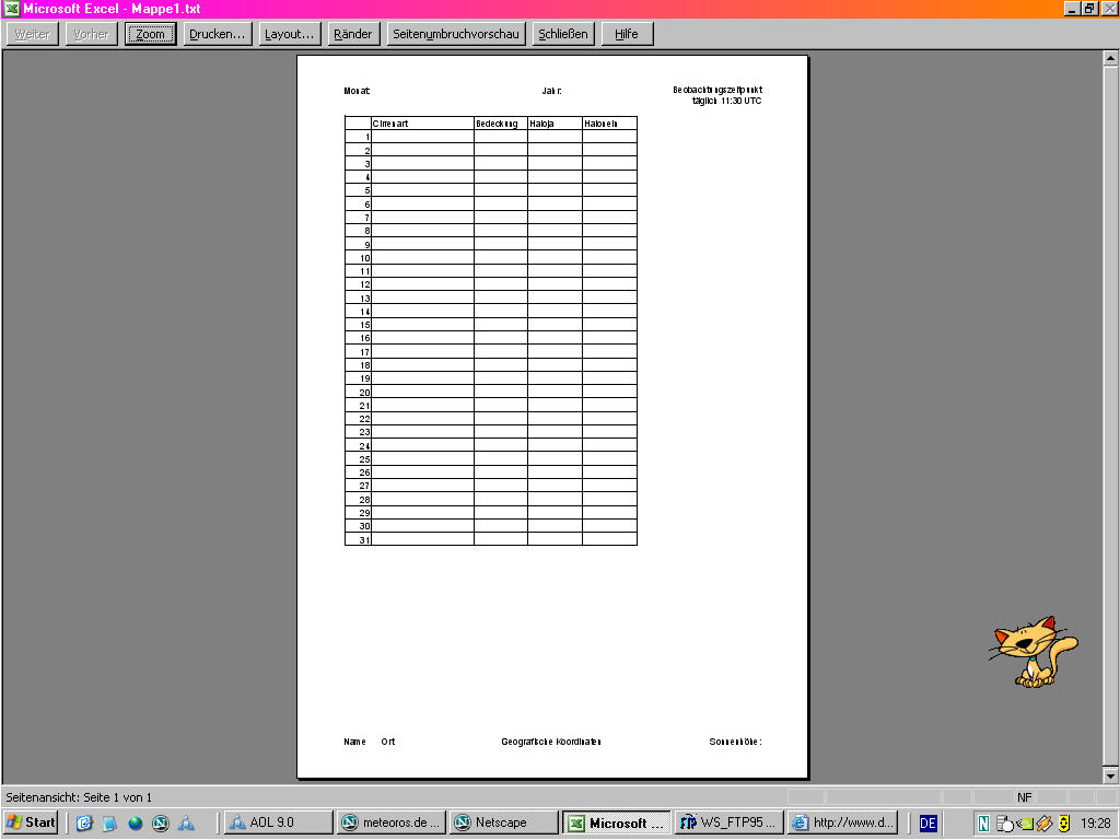 Irgendwie erscheint mir das nicht als sehr praktikabel. Im Gegenteil: Der Halobeobachter hatte nur um 14 Uhr Zeit, zum Himmel zu gucken und trägt nun einen Halofreien Tag ein, obwohl um 12 Uhr Halos zu sehen gewesen wären.