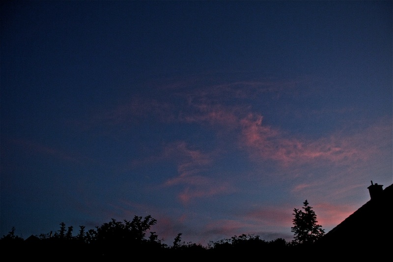Auch gestern am 3. Juli wieder einen auffallend intensiven Sonnenuntergang. Leider konnte ich keine andere Perspektive wählen, mir fiel das Stückchen Rot aus dem Küchenfester zufällig auf, es war gewaltig. Zuvor wurden schon hohe Wolken sehr intensiv gefärbt. Vom Nordbalkon dann leider auch nur noch ein wenig mitbekommen. Eine Gegendämmerungsband gab es aber gestern Abend dann nicht mehr.