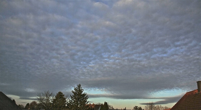 in einer straffen NW Strömung von 3-4 bft, bei 17°C und nur 28% RF (!) zeigten sich viele interessante Himmelsereignisse in einem einzigen Beobachtungszeitraum von nur 1 Stunde. Ein sehr dünner oberer Abschnitt eines 22er Ringes ab 13:13h, danach eine Korona, immer wieder punch-holes und Virgastreifen an einer sehr strukturierten Ac flo, per Decke als auch ein Irisieren und eine Ac len Walze, die sehr mächtig aussah. Die Fallstreifen verursachten hier und da Löcher, die mir nach punch holes aussehen, nicht so sehr strukturiert wie manche spektakulären dieser Art, aber das Potential war deutlich zu erkennen. Scheinbar spielt die trockene Luft bei diesen Erscheinungen irgendwie eine Rolle, als würde da was durchfallen und mit sich reißen. Nur was aber fällt da durch? In den Tauern auf der Rudolfshütte wurden heute Morgen vor Sonnenaufgang nur 10% RF gemessen. Wüstenhafte Verhältnisse.