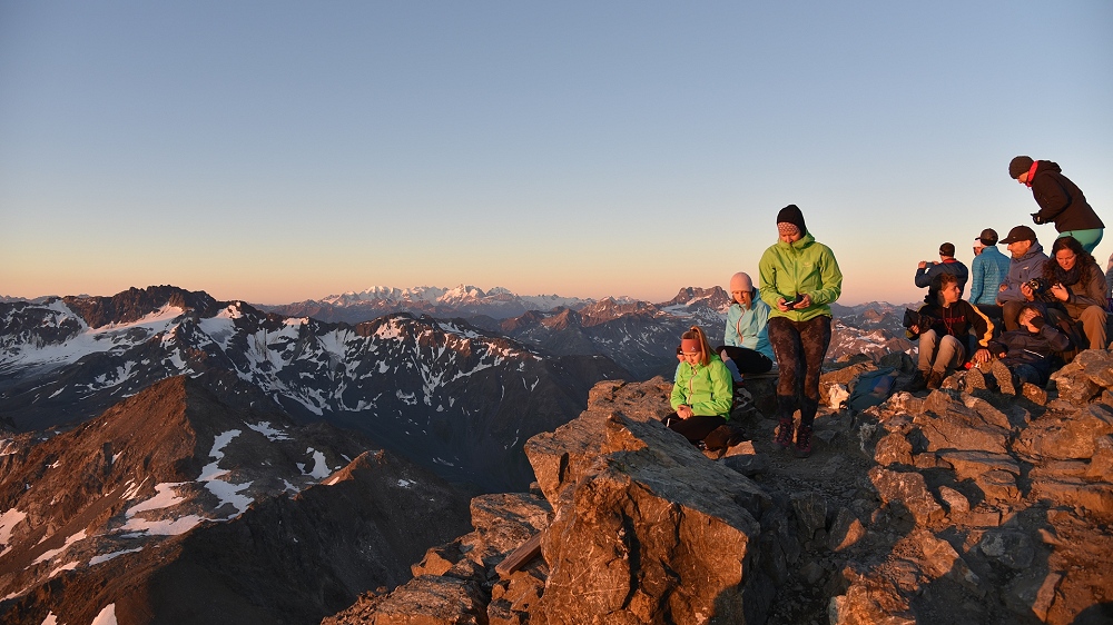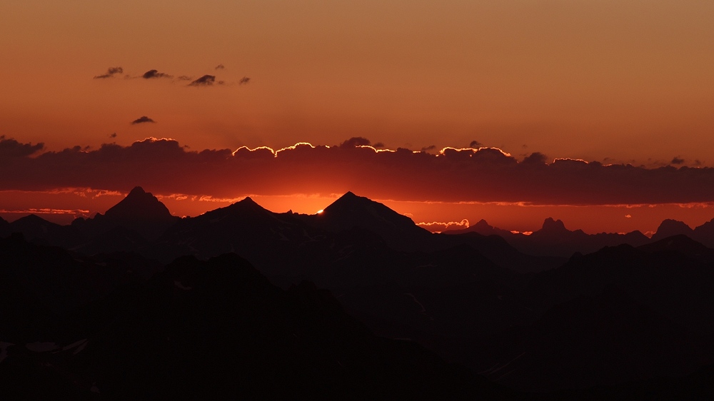 Am 27.7. wollte ich NLCs vom Schwarzhorngipfel (3146m) aus aufnehmen, nachdem am Vormorgen welche sichtbar waren. Leider war es nichts mit NLCs, aber einen Sonnenaufgang von völliger Schwärze aus mitzuerleben ist auch schön, von den vielen Sternschnuppen ganz abgesehen: