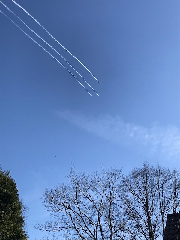 Am Nachmittag des 30.3.21 gegen 15.50 MESZ kam ein Dreiertrupp über die östliche Region Hannover gebrummt. Flugzeuge über uns im Landeanflug nach Hannover-Langenhagen kennt man, die klangen anders.