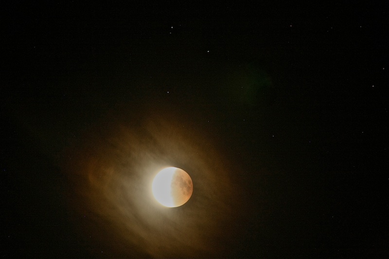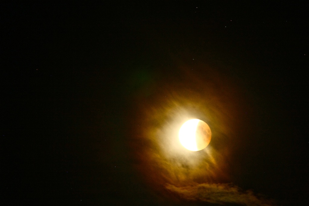das Wetter zeigte sich bei der gestrigen Mondfinsternis nicht gnädig. Ca. 30km südöstlich vor Wien konnte ich den aus dem Erdschatten tretenden Mond durch abgewehte Eiswolken eines CB Schirmes fotografieren und meine doch eine Korona zu erkennen.