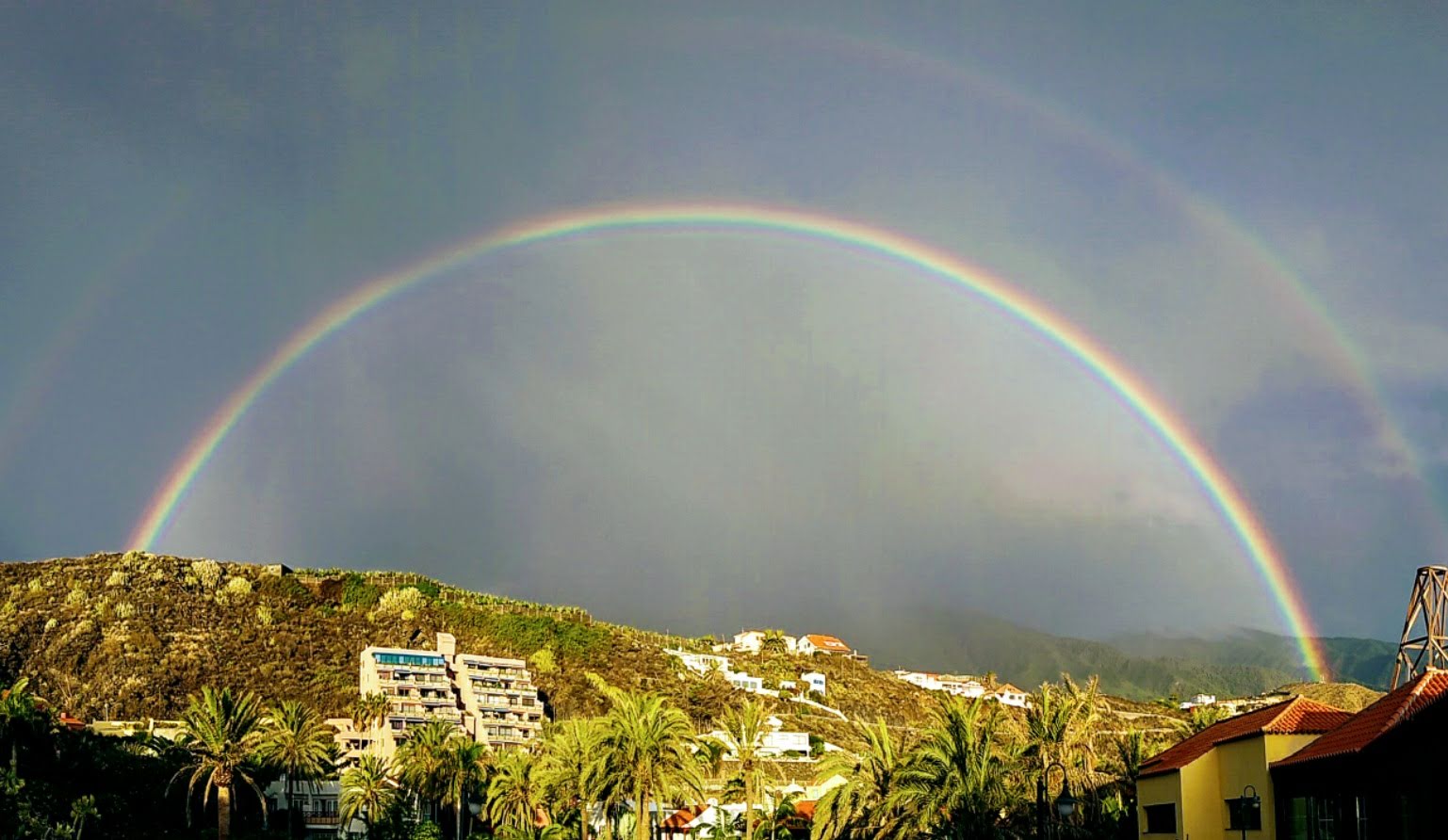 roter Regenbogen mit Interferenzbögen und sekundärem Bogen