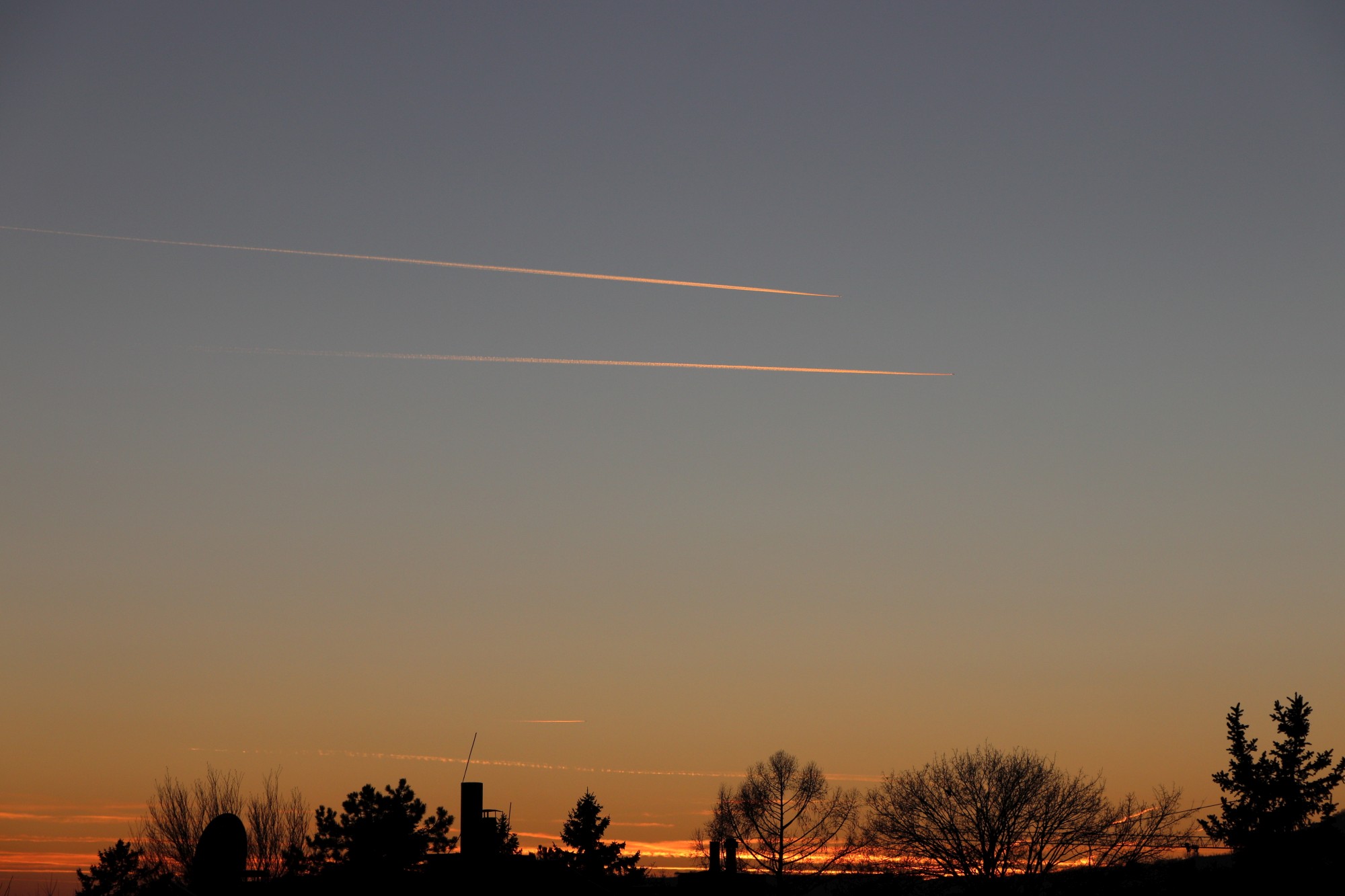 Die Atmosphäre über dem Wiener Becken war heute sehr viel trockener als die vergangenen Tage, so dass sich der Sonnenuntergang nicht spektakulär gestaltete, Kondensstreifen lösten sich binnen wenige Sekunden wieder auf. Dafür zeigte sich aber im Gegenlicht des SU der Gürtel der Venus sehr eindrucksvoll.