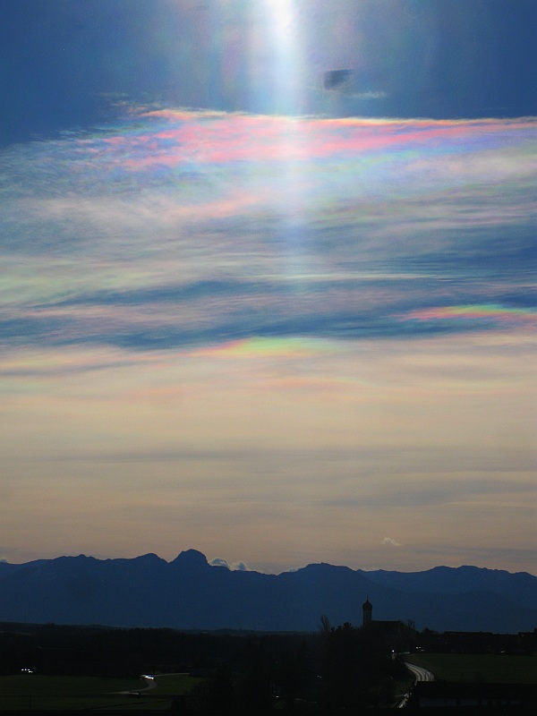 Wir haben aber auf einer Webcam ein paar Tage später einen 22°-Ring entdeckt, auf dessen Grundlage sich die Entfernung des Irisierens von der Sonne abschätzen lässt. Die weitesten erkennbaren Farben haben nahezu den doppelten Sonnenabstand wie der Ring, also ca. 45°. Das wiederum lässt dann doch eher auf Eiskristalle schließen?