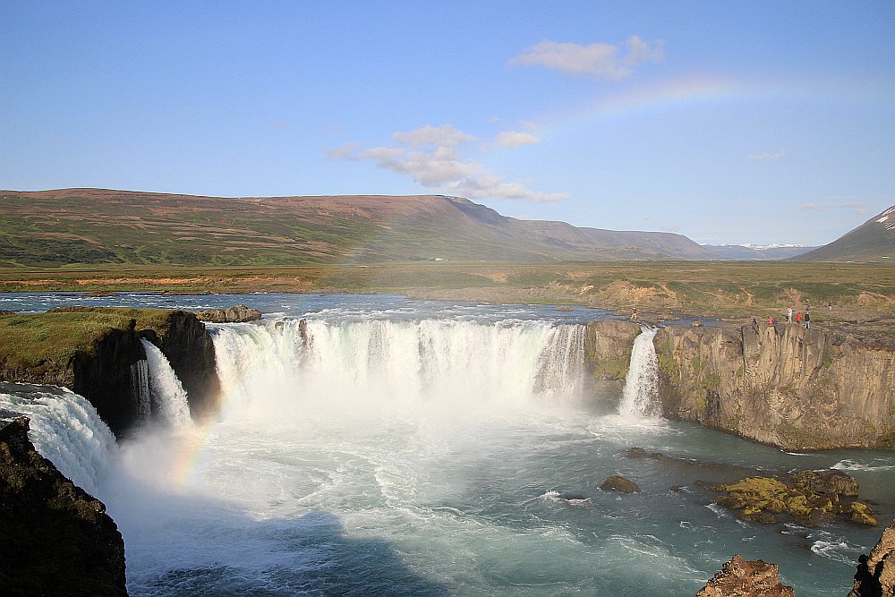 In der Nähe des Godafoss (Wasserfall der Götter) lag unser Ferienhaus für die Erkundung des Nordens (Häuser im Hintergrund).