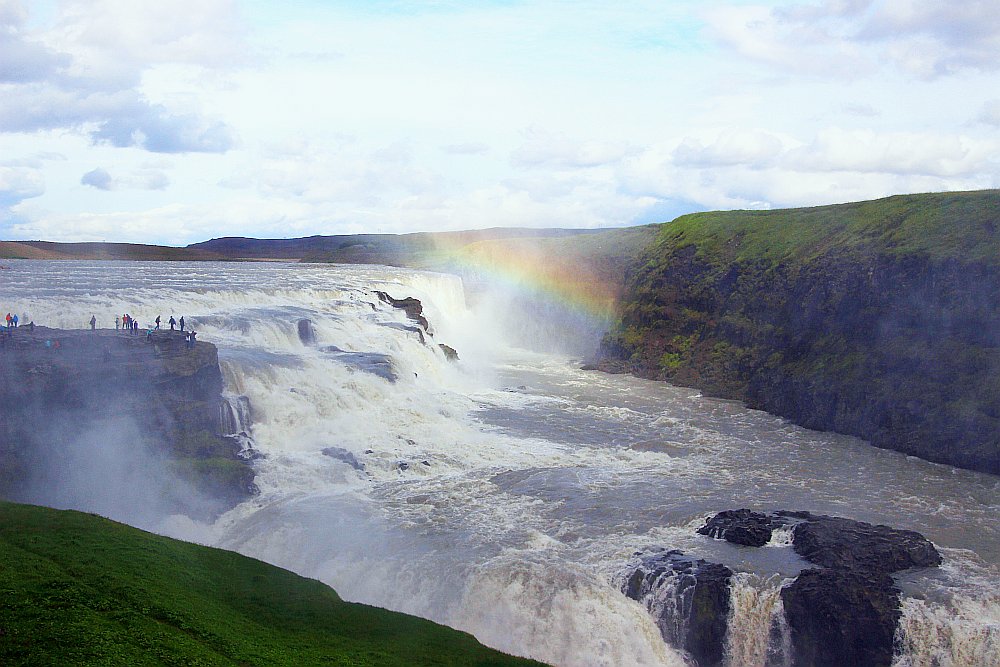 Am Gullfoss (Goldener Wasserfall) warteten wir fast umsonst auf einen Regenbögen. Nur für 2 Minuten entstand eine Wolkenlücke!