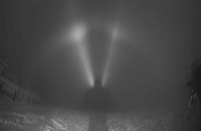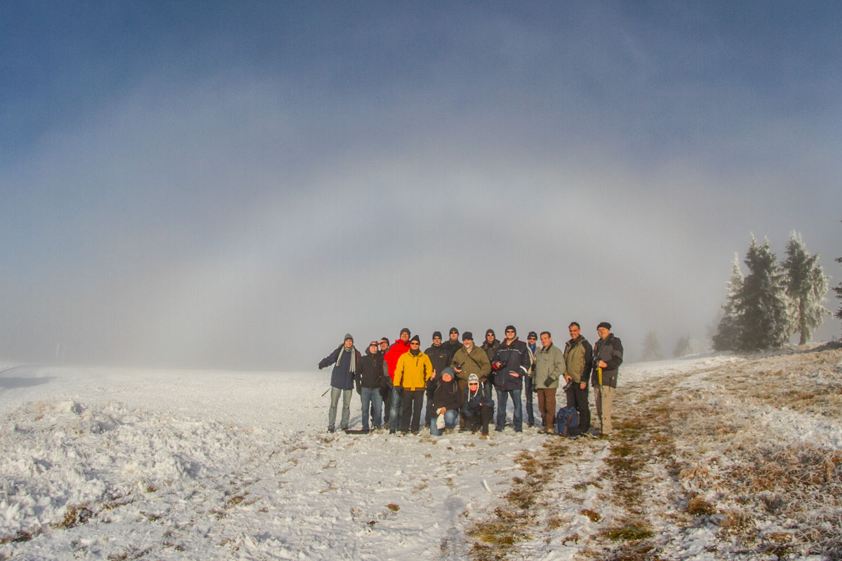 Außer einem kleinen Begrüßungshalo am Freitag, welches aber nur die wenigen Frühankömmlinge gesehen habe, gab es keine weiteren Eisnebelhalos. Aber es muß ja auch noch eine Steigerung für die nächsten Male geben!! Denn auch so gab es atemberaubende Nebelstimmungen im, am oder über dem böhmischen Nebel. Und auch der Bozi Devil hat sich mehrmals blicken lassen. Ansonsten gab es wieder interessante Vorträge und Experimente und natürlich Michas neuesten Halomator zu bewundern und erleben.