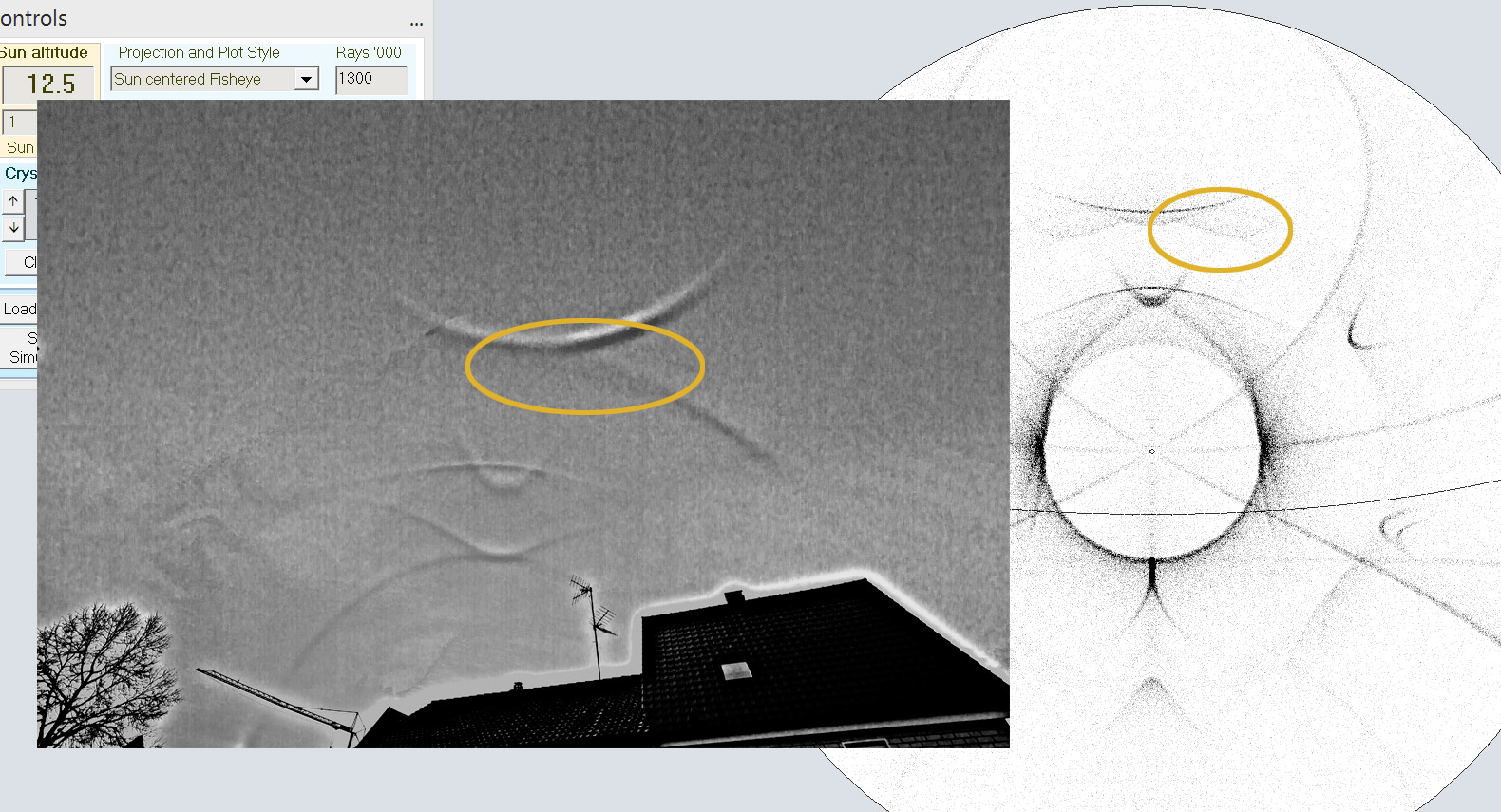 Als ich vor kurzem die Lowitz-Bezeichnungen für den Haloschlüssel überarbeitet habe, habe ich die Kategorie "oberer kreisförmiger Lowitzbogen" so angelegt, dass darin mit steigender Sonne der oberere den mittleren (Greenlers Namen) ablöst, weil das am verträglichsten mit den bisherigen Beobachtungsdaten ist. Da blieb natürlich das Problem mit der "Nahtstelle" in der Sonnenhöhe, d.h. dem sehr schmalen Bereich, in dem oberer und mittlerer Lowitz (und beide Parrys) gleichzeitig auftreten... und jetzt gibts ein paar Wochen später ausgerechnet zu diesem "Problemfall" Bildmaterial!