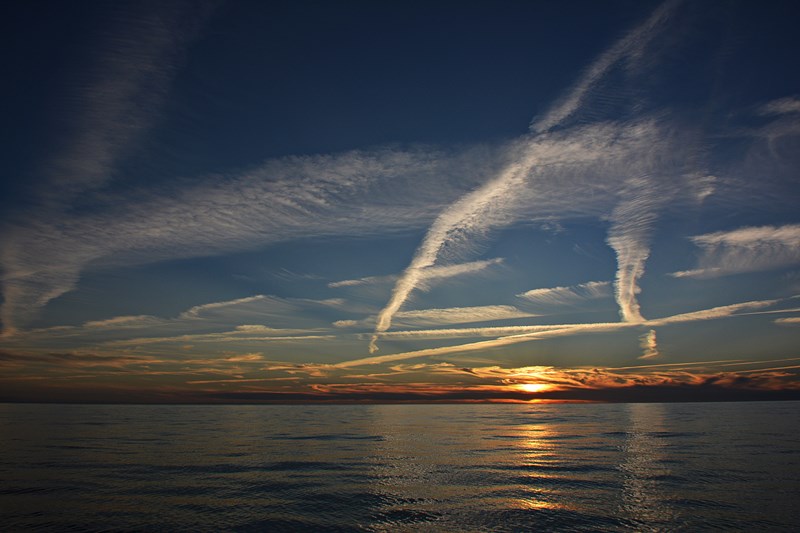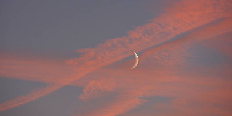 Jede Menge Kondensstreifen am Himmel. Gegendämmerung. Der Mond hinter den angeleuchteten Kondensstreifen. Ein einzelner Kondensstreifen "kreuzt" den Mond. Tolle Wolkenstimmung nach Sonnenuntergang. Windstärke 0 - das sieht man auch nicht alle Tage . . . Schöne Grüße