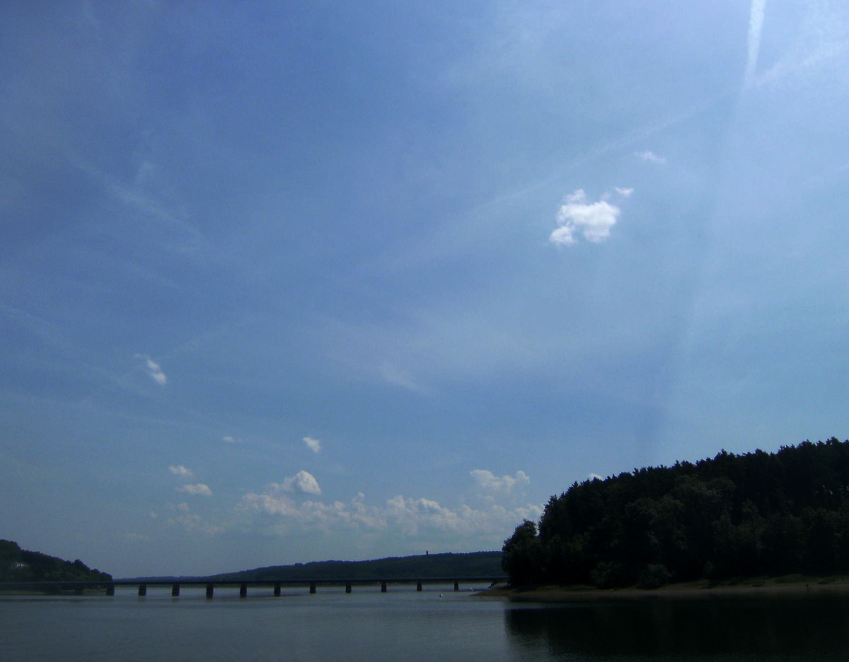 und ein bis zum Boden reichender Kondensstreifenschatten, aufgenommen am 29.05. am Möhnesee:
