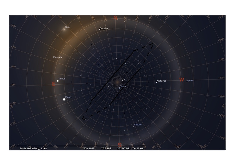 Ab 4:00 war es für die Meteorbeobachtung zu hell, so dass ich Dämmerungsbeobachtungen machte – nicht zum ersten Mal. Aber heute früh ist mir ein Phänomen aufgefallen, dass ich bisher nicht beobachtet habe: Um 4:23 bemerkte ich ein dunkles Band (hier war der Himmel am dunkelsten) quer über den Himmel: zwischen Alpha und Eta UMa (also über die gesamte Breite des Großen Wagens) im W über den Zenitbereich (zwischen Deneb und Wega) bis zwischen Atair (Alpha Aql) und Epsilon Peg im Westen. Dieser auffällig dunklere Streifen am Himmel erinnerte mich sofort an den dunkleren Himmelsbereich in 90° Sonnenabstand bei tiefsteheder Sonne und sehr klarem Himmel, der durch die Rayleigh-Streuung verursacht wird. Hier aber stand die Sonne noch 9° unter dem Horizont. Die Ausrichtung des Bandes war aber genau quer zur Sonnenrichtung (s. Bild). Als ich mich um 4:41 auf den Heimweg machte, war das Band immer noch zu erkennen.