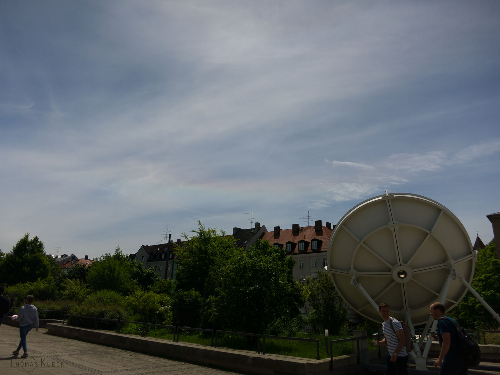 13:21 MESZ: schwacher ZHB, Bild abgedunkelt und leicht kontrastverstärkt: Um 13:31 MESZ hat der ZHB schließlich die größte Helligkeit mit h1 erreicht. Besonders hat mir gefallen, dass alle Farben deutlich auch ohne Sonnenbrille zu sehen waren. Bei vielen anderen ZHBs war immer nur eine Farbe visuell zu sehen (Sonnenhöhe: 64°28'): Im weiteren Verlauf wurde er wieder schwächer, dafür hat die Ausdehnung zugenommen. Um 13:47 MESZ hatte er eine Ausdehnung von etwa 40°, wobei visuell der helle linke Teil (h=0) und der Teil unten in der Mitte (h=0 überwiegend blau) zu sehen war. Oben im Bild ist auch ein Teil des 22° Ringes zu sehen, mit dessen Hilfe man die Ausdehnung besser erahnen kann. Die Sonne stand dabei etwas rechts von der Schüssel, es war also fast ausschließlich der linke Teil zu sehen (Sonnenhöhe: 63°50'): Während meiner Beobachtung durfte ich mit einigen Kommilitonen Aufklärungsgespräche über Halos führen und habe mich neben der Beobachtung schließlich meinen Technische Mechanik Unterlagen gewidmet (ja, heute gab es die volle Drühung TM für mich).