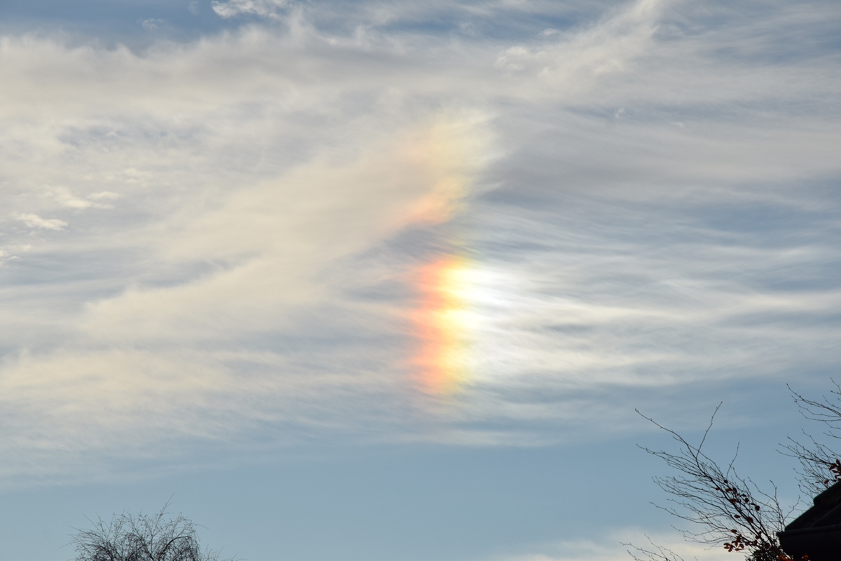 auch von mir ein kleiner Schnappschuss von der in der Tat sehr hellen rechten Nebensonne vom Montagnachmittag. Eine gute halbe Stunde später in Hamburg aufgenommen (13.11. um 15:11 MEZ), leider nur mit dem Smartphone. Sie war auch nur von kurzer Dauer. Ein ZZB war dagegen nicht zu erkennen...