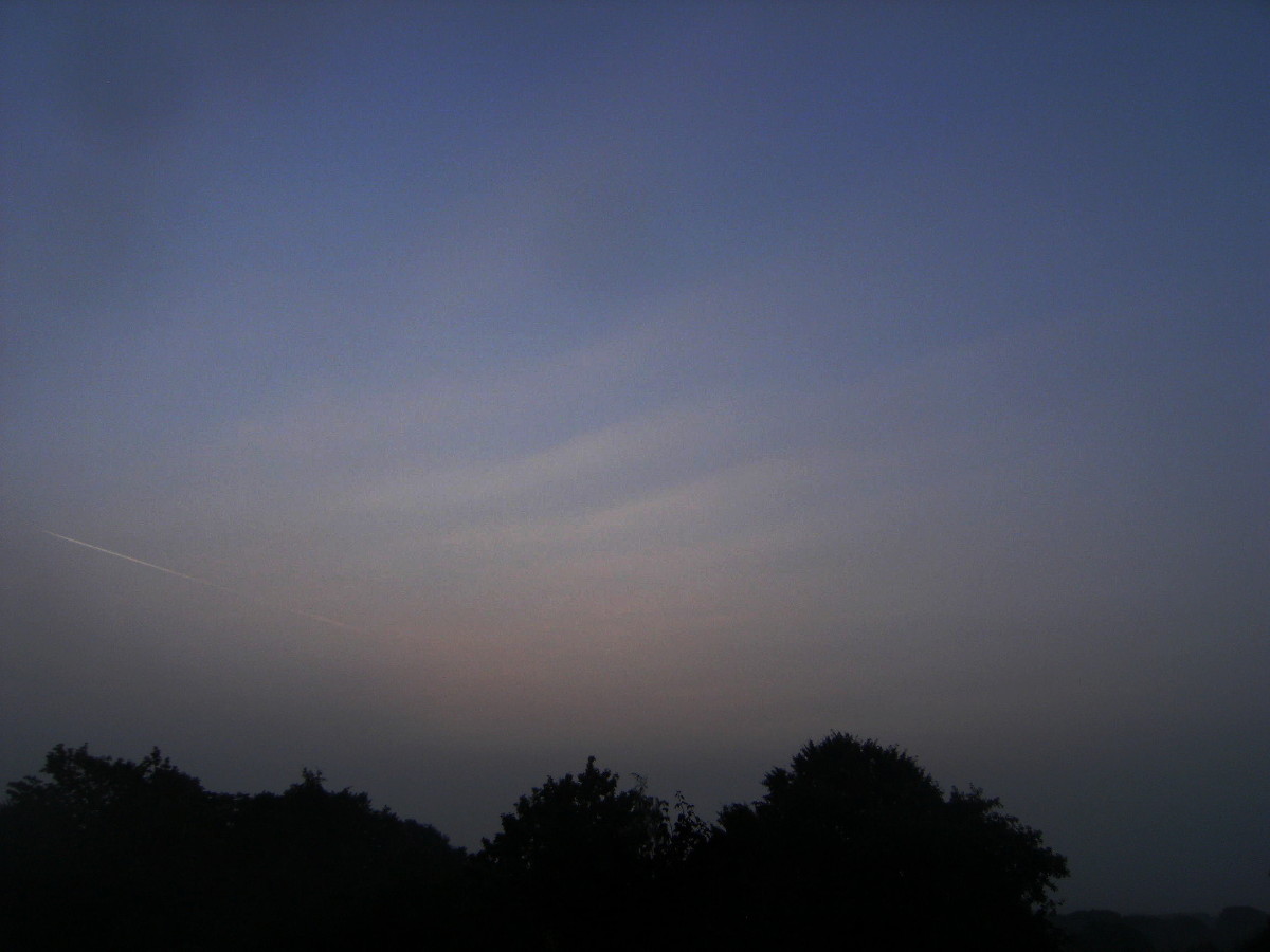 Hier von mir noch ein Bild vom Morgen des 23. August. Da waren morgens kurz nach Sonnenaufgang seltsame Dunstwellen zu sehen. Ich weiß allerdings nicht, in welcher Höhe die sich befanden. Sie sahen aus wie hohe Wolken, aber es war an jenem Morgen ziemlich dunstig, könnte auch der Dunst gewesen sein.