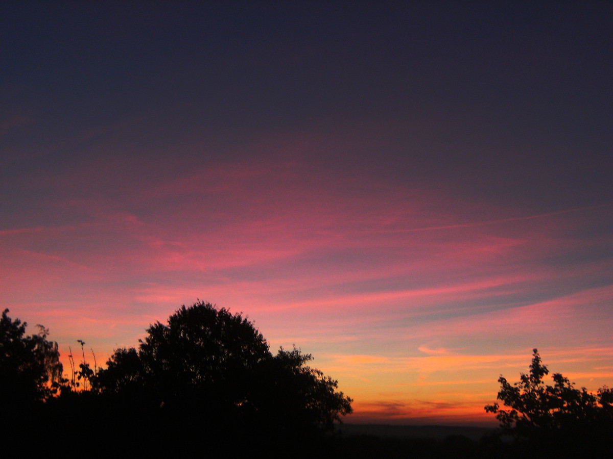 Der Tag heute war so ein richtiger "Atmosphärentag". Es begann um 7.15 Sommerzeit mit einem leichten Morgenrot und Dämmerungsstrahlen: Am Nachmittag so gegen 16 Uhr Sommerzeit Schattenstrahlen an einem Kondensstreifen, und als Zugabe noch eine linke Nebensonne: Der Knaller kam aber dann am Abend. Zwischen 18.55 und 19.15 Uhr gab es ein leuchtend helles Abendrot an Cirrus spissatus mamma: Grüße