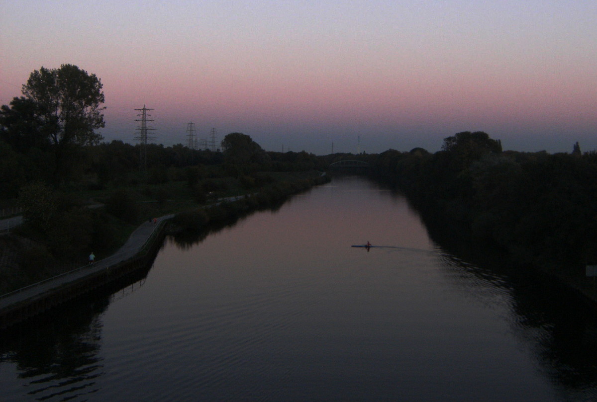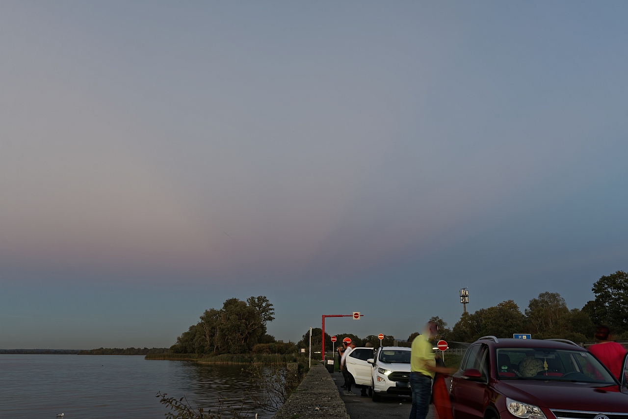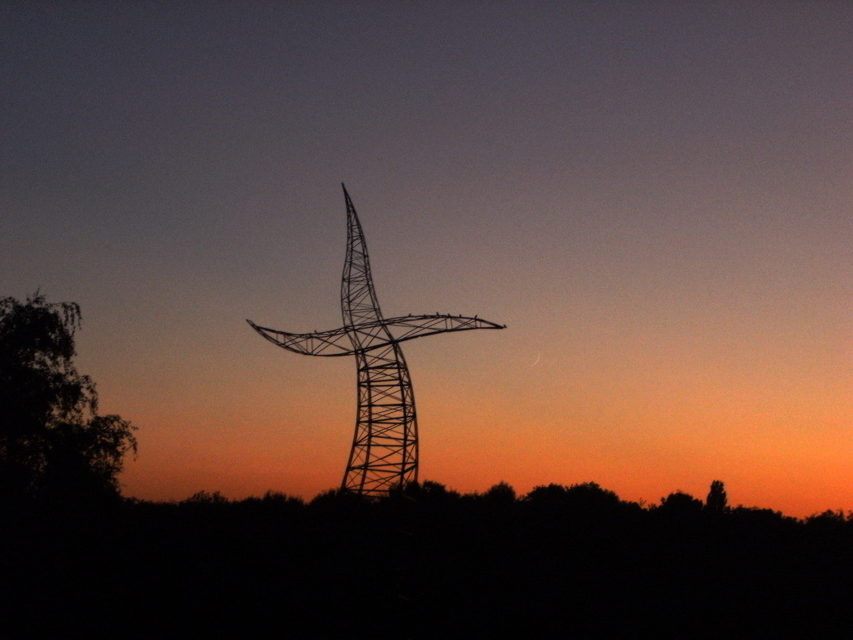 Schon kurz vor Sonnenuntergang färbte sich der Westhimmel gelb-orange, ganz ohne Wolken: Gegen 19 Uhr MESZ erschien dann im Osten ein sehr deutlicher Erdschatten mit intensiver Gegendämmerung: Noch etwas später, zwischen 19.15 und 19.30 Uhr im Westen helles Purpurlicht und Dämmerungsstrahlen: Auch eine dünne Mondsichel war da: Dieser seltsame tanzende Strommast ist übrigens eine Skulptur namens "Zauberlehrling".