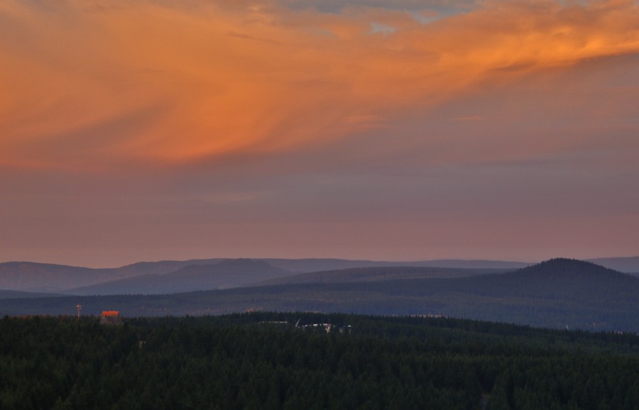 Gestern gab es auf dem Fichtelberg einen morgenroten Streifen. Auf dem Telebild sieht man unseren dampfenden "Vulkan" Kupferberg (Měděnec) im Morgenlicht.
