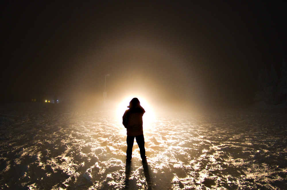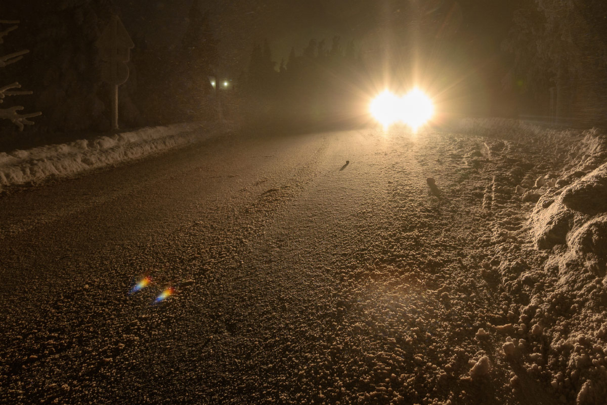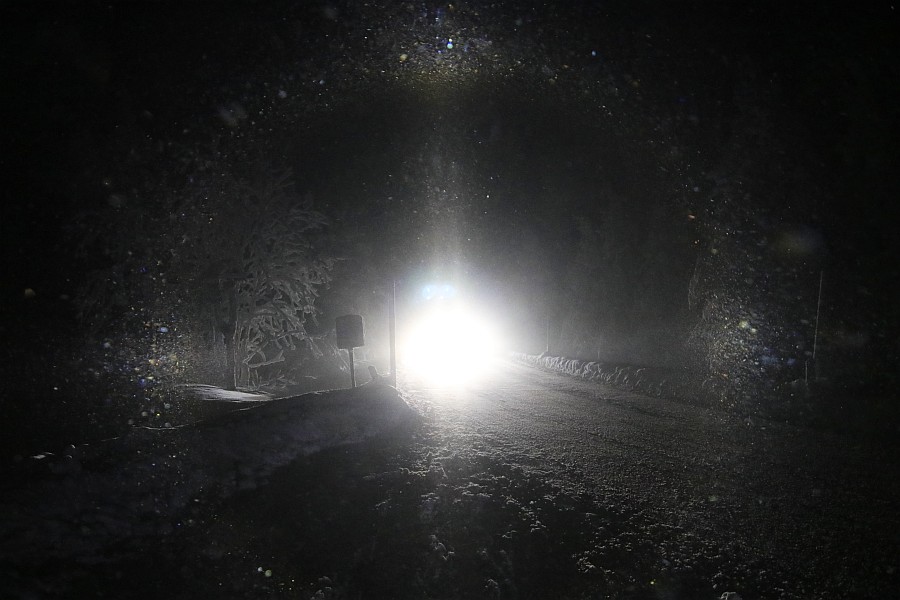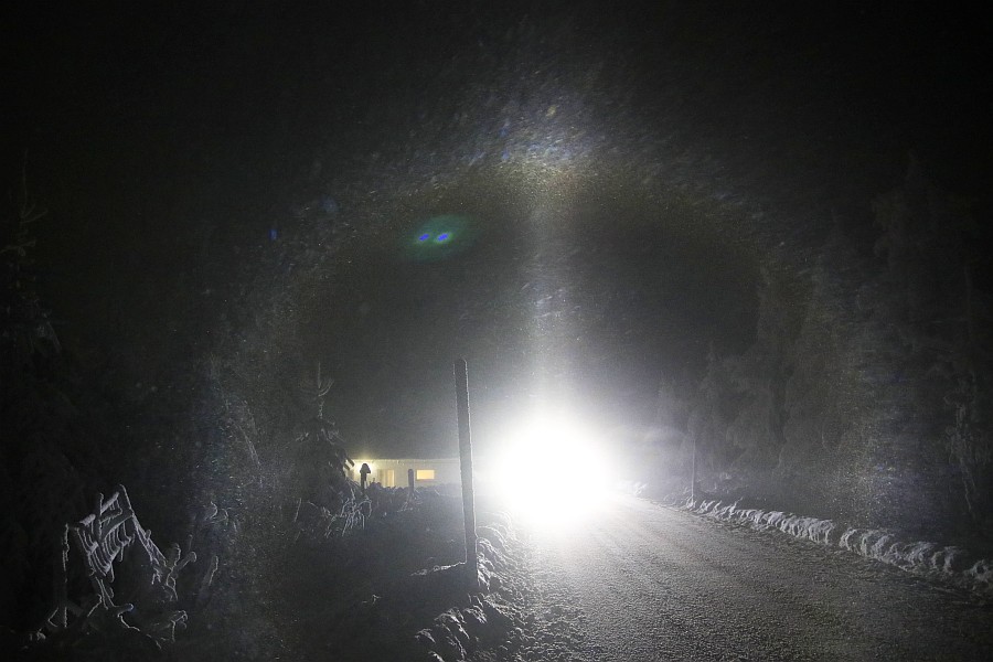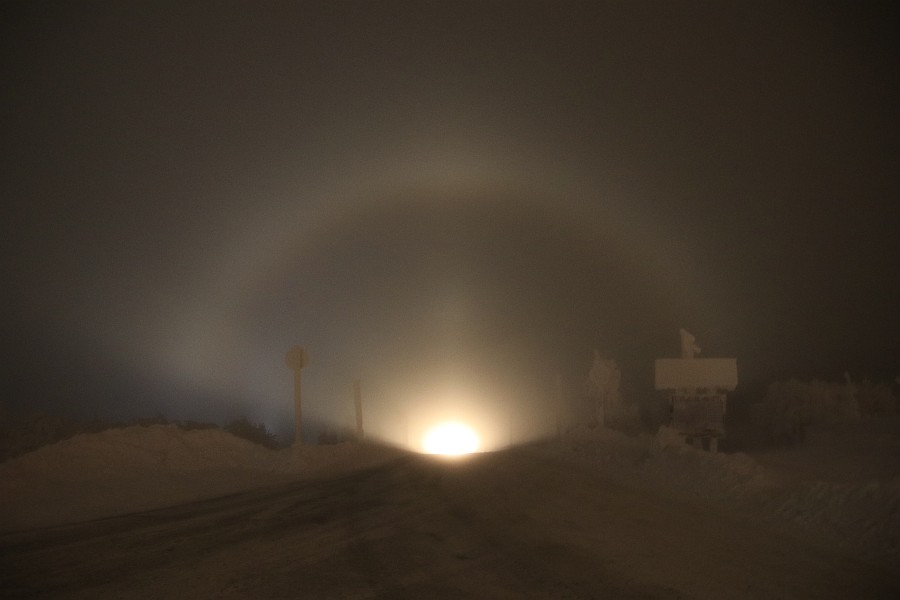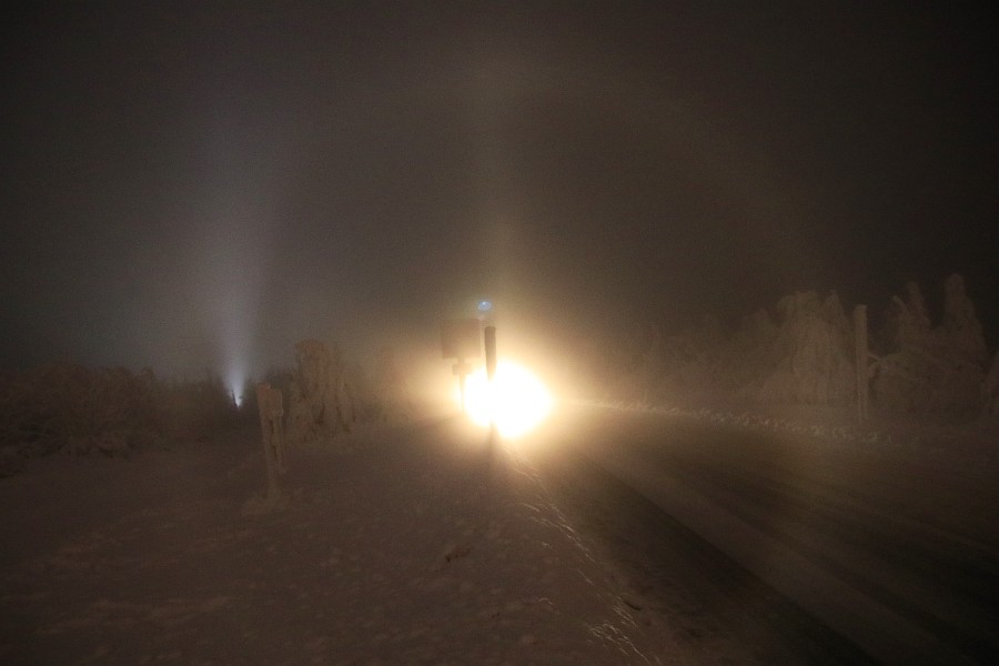 Nach Dienstschluss um 17 Uhr habe ich eine kleine Runde gedreht, als mir auffiel, dass jedes den Berg herunterkommendes Auto Lichtsäulen und/oder 22°-Ring mit reichlich Co. mit sich herschleppte. Ein Stativ hatte ich nicht mit, also hab ich im Schnee experimentiert, bis ich die Hände nicht mehr gespürt habe. Folgende Haloarten waren zu sehen: 22°-Ring, 2 bis 4 Nebenlampen, oberer und unterer Berührungsbogen, obere und untere Lichtsäule, tlw. 46°-Ring, Horizontalkreis(e) und Moilanenbögen.