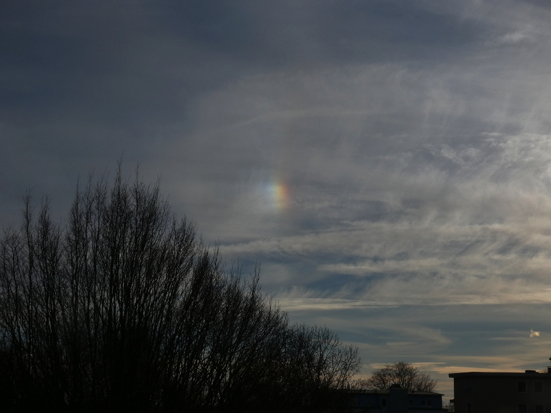 Heute früh gegen 9.30 Uhr: Beide Nebensonnen mit schwachem 22°-Ring heute mittag: Nebensonne mit Schweif, ca 14. Uhr: Und Nebensonne ganz bunt etwa eine halbe Stunde später: Grüße