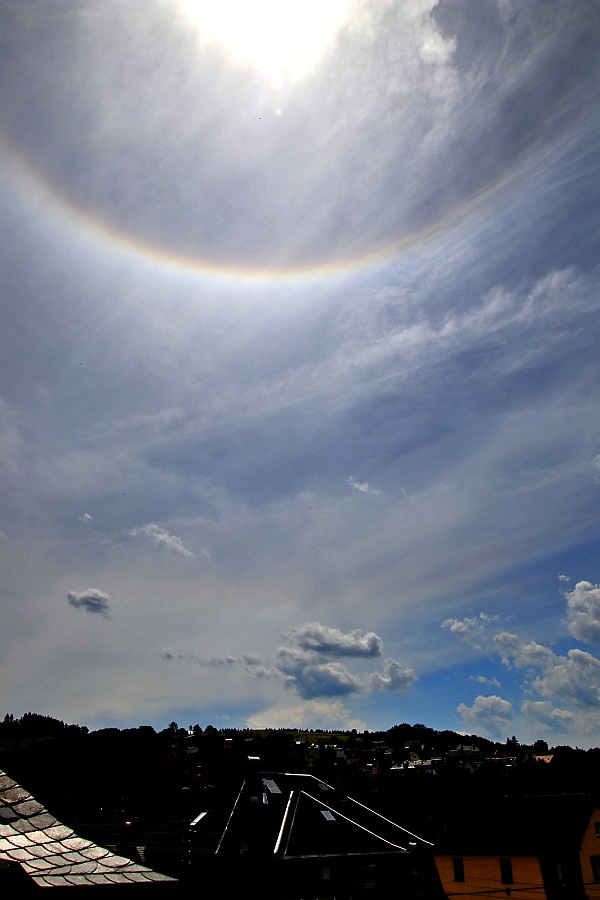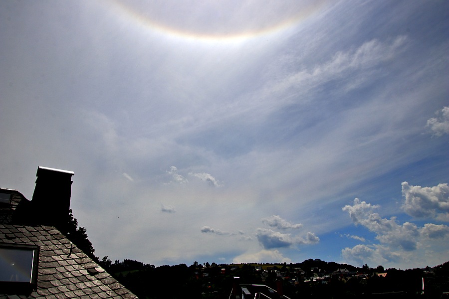Später kamen nur noch zwei grenzvisuell angerötete Wolkenfetzen unter die Sonne. Ansonsten gab es an anderen Cirren weder mehr vom ZHB, noch einen 22er oder Horizontalkreis.