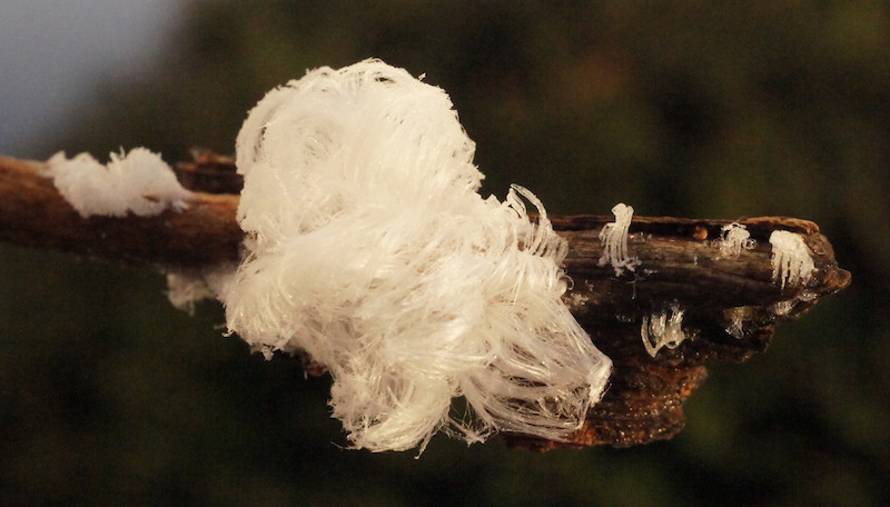 Seit gestern habe auch ich wieder einen Haareiszweig auf der Terrasse liegen. "Treibt" dieser aus, weiß ich, wann sich ein Ausflug in unseren Hauswald zwechs Haareissuche lohnt. Und schon jetzt produziert dieser ordentlich Haareis:
