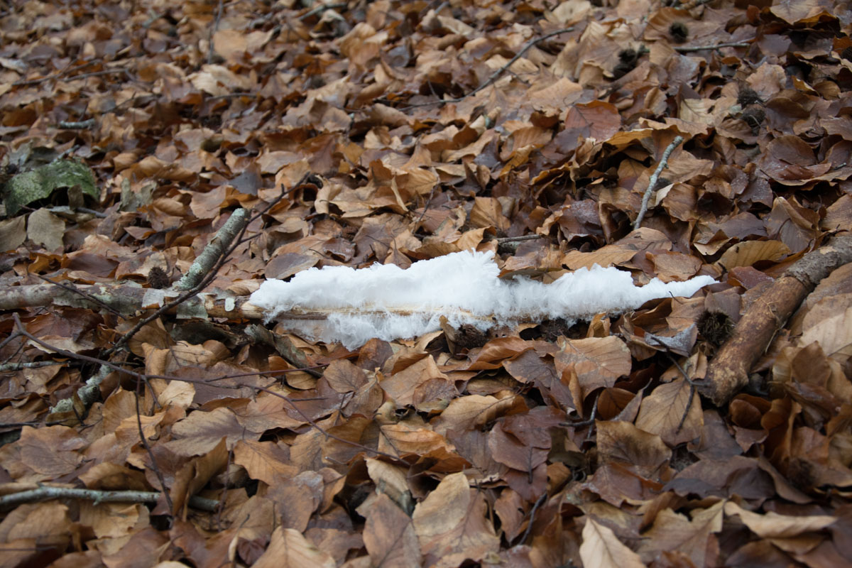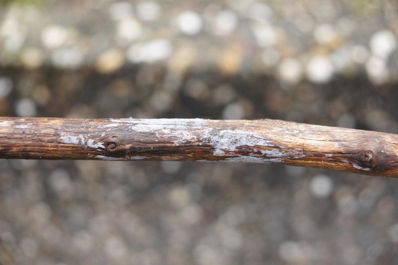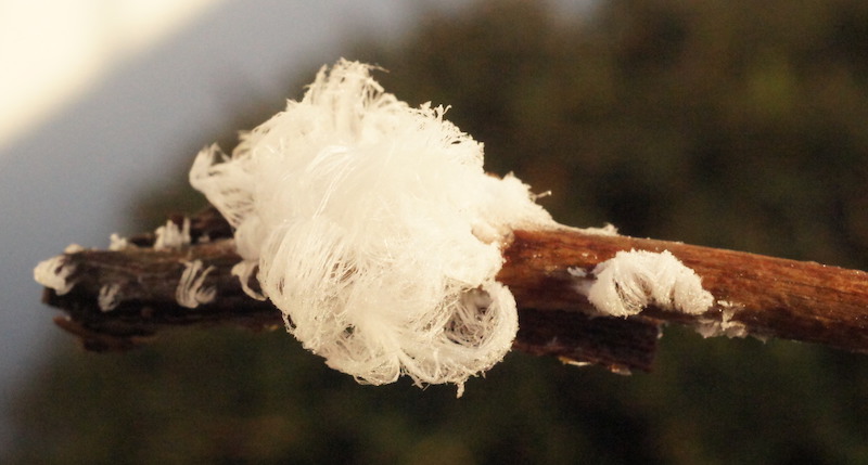 Letztes Jahr am Weihnachtstag habe ich beim Spaziergang im Wald ein Ast mit etwas Haareis entdeckt – das erste, das ich hier im Heidelberger Raum je zu Gesicht bekommen habe. Kurz entschlossen nahm ich den Ast mit – und jeden Morgen mit Frost brachte er schönes Haareis hervor. Nach dem Winter habe ich die Astfragmente hinter das Haus gelegt, und jetzt im Dezember wieder ausgelegt. Bei den leichten Frostnächten bis Mitte Dezember zeigte sich kein Haareis. Ich dachte schon, dass die verursachenden Pilze den Sommer vermutlich nicht überlebt haben. Und heute Früh war es dann doch so weit: ein schneeweißer Fleck deutete an, dass sich wieder Haareis gebildet hatte. Es war eher ein Büschel, wie ich es im letzten Winter nicht beobachtet habe. Aber der Ast ist wieder aktiv. Zur Stunde produziert er bereits zum zweiten Mal Haareis: ich bin gespannt, wie das morgen früh aussehen wird.