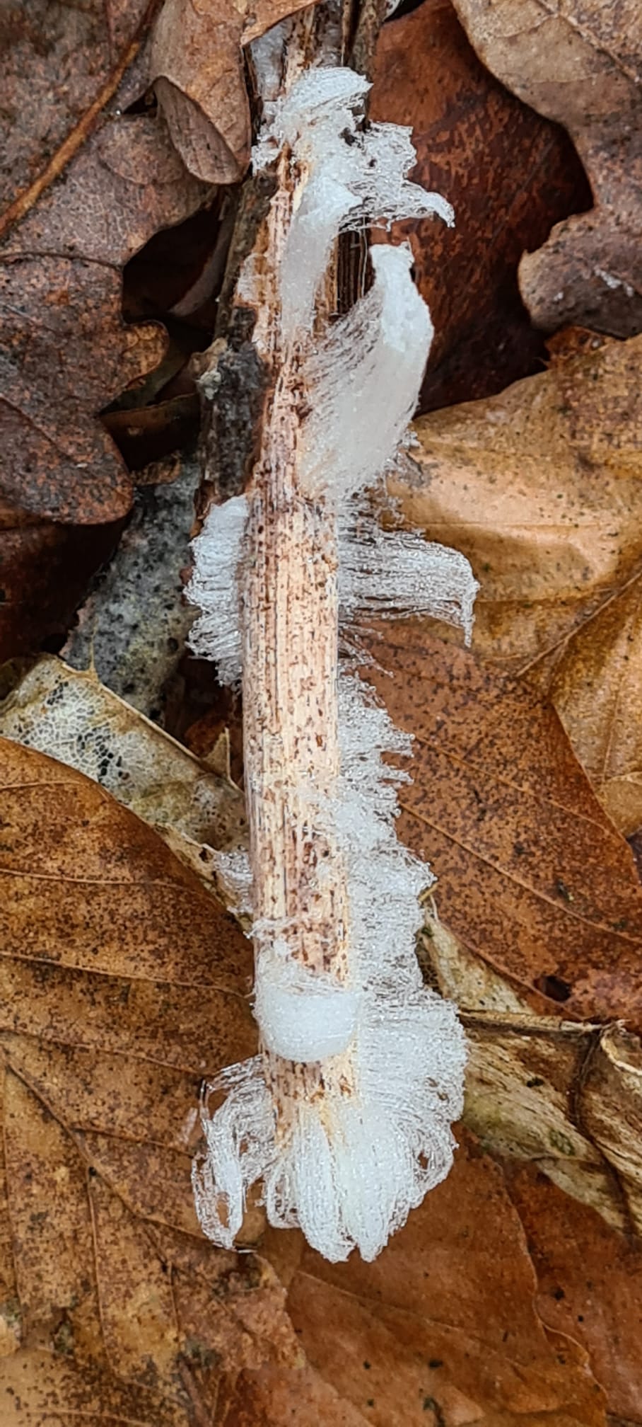 Ich habe aufgrund der Witterung ebenfalls auf Haareis gehofft. Also bin ich heute (28.12.2019) zum „Riesewohld“ hier im Kreis Dithmarschen aufgebrochen. Letztes Jahr hatte ich an dieser Stelle nur ganz wenig Haareis gefunden. Ohne allzu große Erwartung habe ich den Wald betreten und schon nach wenigen Schritten schaute ein erster kleiner Zweig mit Haareis unter den Blättern hervor. Etwas abseits des Weges konnte ich schon von weitem viele weiße Stellen erkennen. Hier mal eine Auswahl: