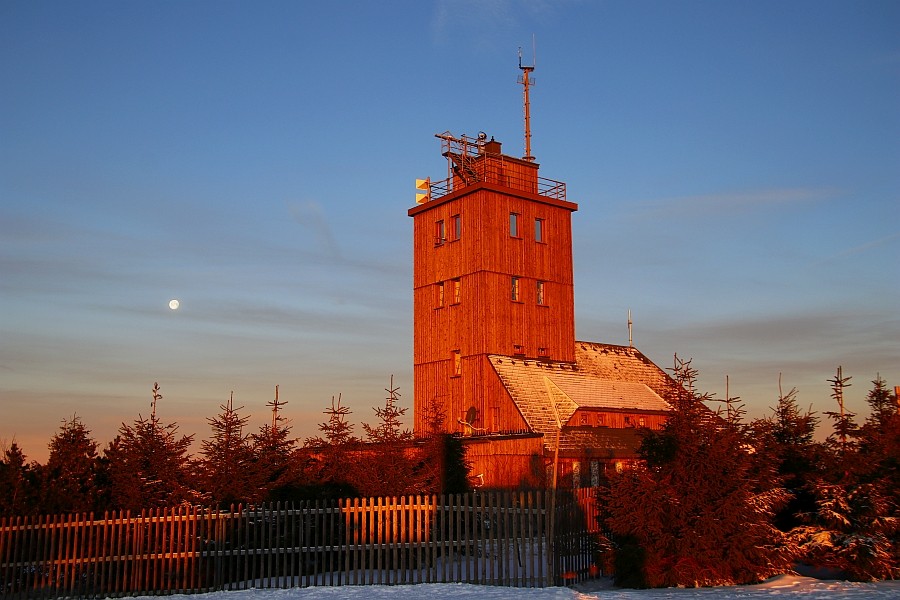 wir waren heute Morgen mal wieder auf dem Fichtelberg mit ein letztem bisschen Resthoffnung auf Eisnebelhalos. Die gab es natürlich nicht. Aber der Fichtelberg wäre nicht der Fichtelberg, wenn er uns mit leeren Taschen wieder heim schicken würde. Insofern zauberte er am Anfang ein schönes Morgenrot, welches sich bis in den Südwesten erstreckte.