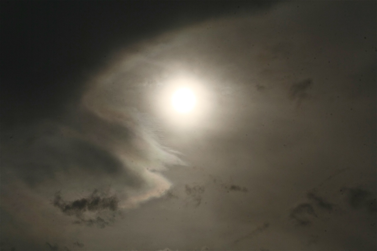 46°-Ringbereich: Die Messung erfolgt mit der "Handmethode" - ausgestreckter Arm, mit Daumen und kleinem Finger eine möglichst weite Spanne machen - der Abstand der Fingerspitzen entspricht dann etwa 22°; und dieser Abstand mal zwei ergibt einen Abstand von der Sonne von ca. 44° und noch eine Kleinigkeit dazu = 46°. Sicherlich wäre es bei dieser besonderen Haloform sehr wichtig, den Abstand noch genauer zu bestimmen. Über die genauen Entstehungsvoraussetzungen dieser farbigen Flecken müsste man einmal bei den Finnen nachfragen.