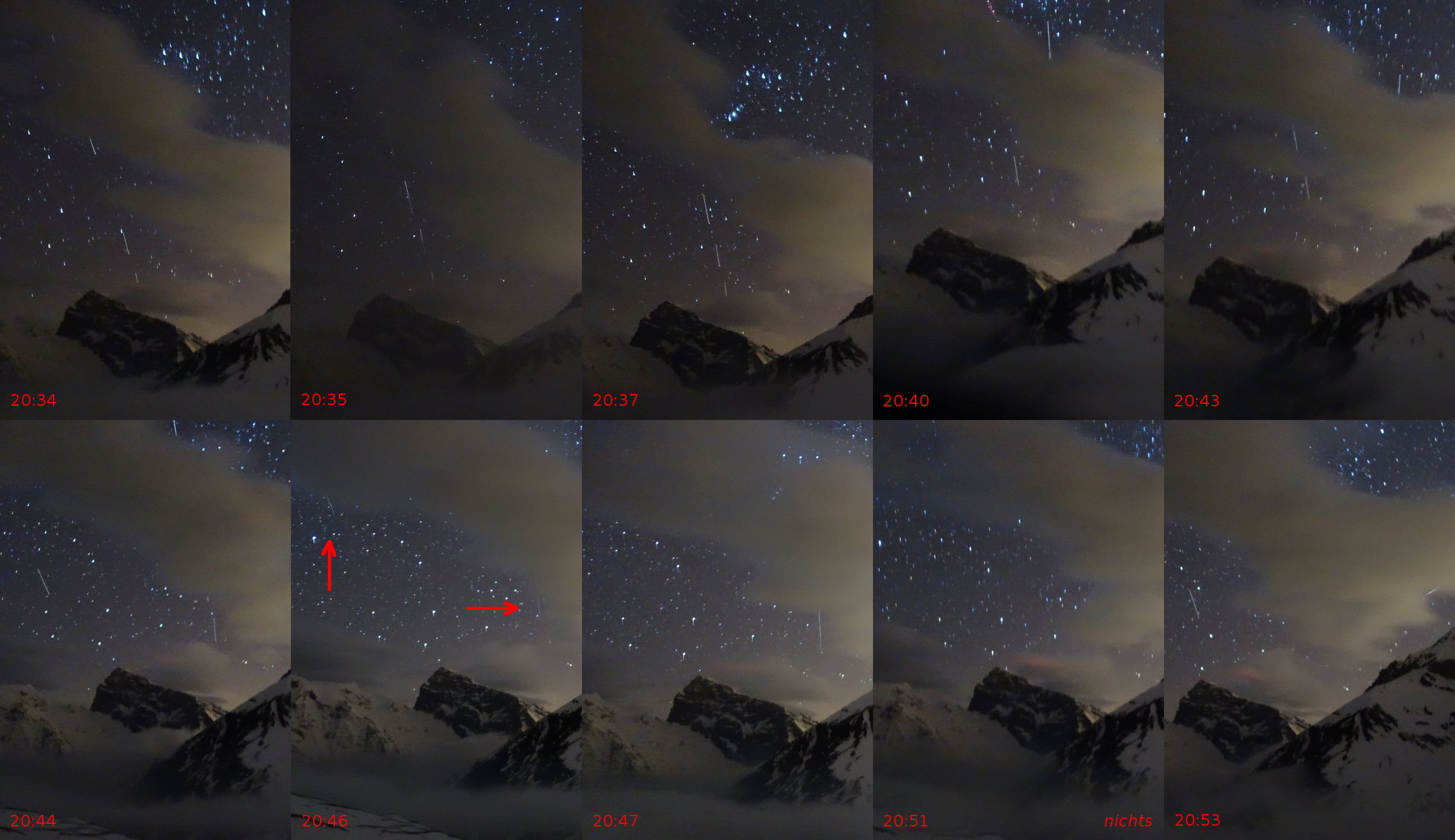Hat jemand eine Ahnung, wie diese Lichtspuren zustande gekommen sein könnten? Es waren keine Satelliten, keine Flugzeuge, keine Meteore... visuell habe ich sie nicht wahrgenommen, sie erschienen nur auf den Fotos, jedes Mal etwas versetzt und teils auch hinter den Wolken verschwindend. Während der letzten Aufnahmen habe ich auch bewusst in die Richtung geschaut und nur einmal glaubte ich ganz schwach einen Lichtstreif auch mit den Augen gesehen zu haben... Wenn sie real vorhanden waren, dann sehr sehr schwach.