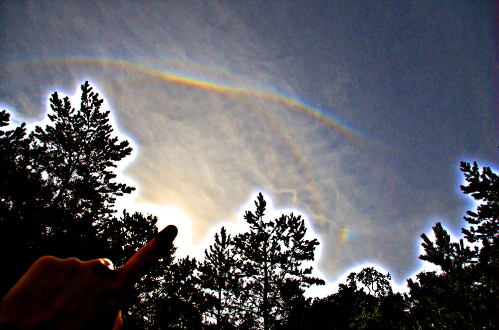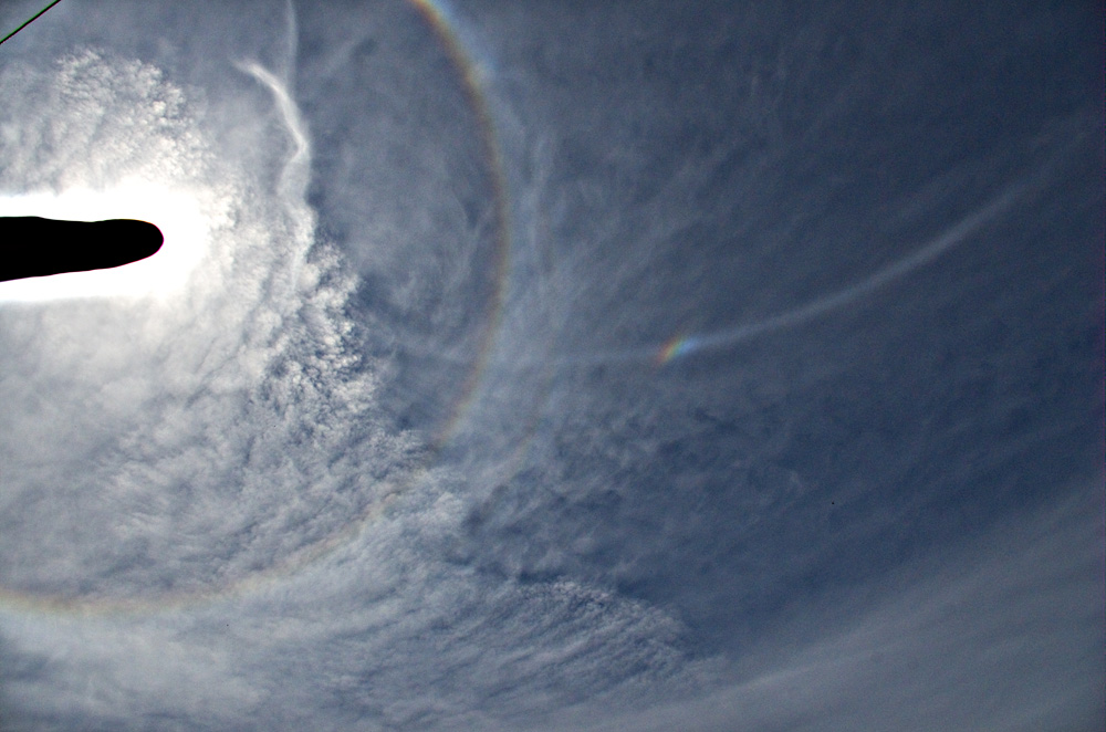 Ein paar Minuten später entwickelte sich der obere Berührungsbogen sehr prächtig. Einen so ausladenden OBB hatte ich seit dem Halotreffen im November 2015 auf dem Fichtelberg nicht mehr gesehen. Hier kam nun noch der Parrybogen dazu, und fotografisch ist sogar eindeutig festgehalten, wie er sich vom OBB weiter weg vom Sonnenvertikal wieder abspaltet (im Bild ca. oberhalb der Nebensonne). Visuell ist mir das aber nicht aufgefallen, aber von idealisierten Simulationen her war mir der Effekt bekannt. Die Sonnenhöhe lag übrigens bei 31°, also noch knapp unter der Grenze zum umschriebenen Halo (wenngleich von der Theorie her die Idee einer harten Grenze hier auch Schwierigkeiten mit sich bringt).